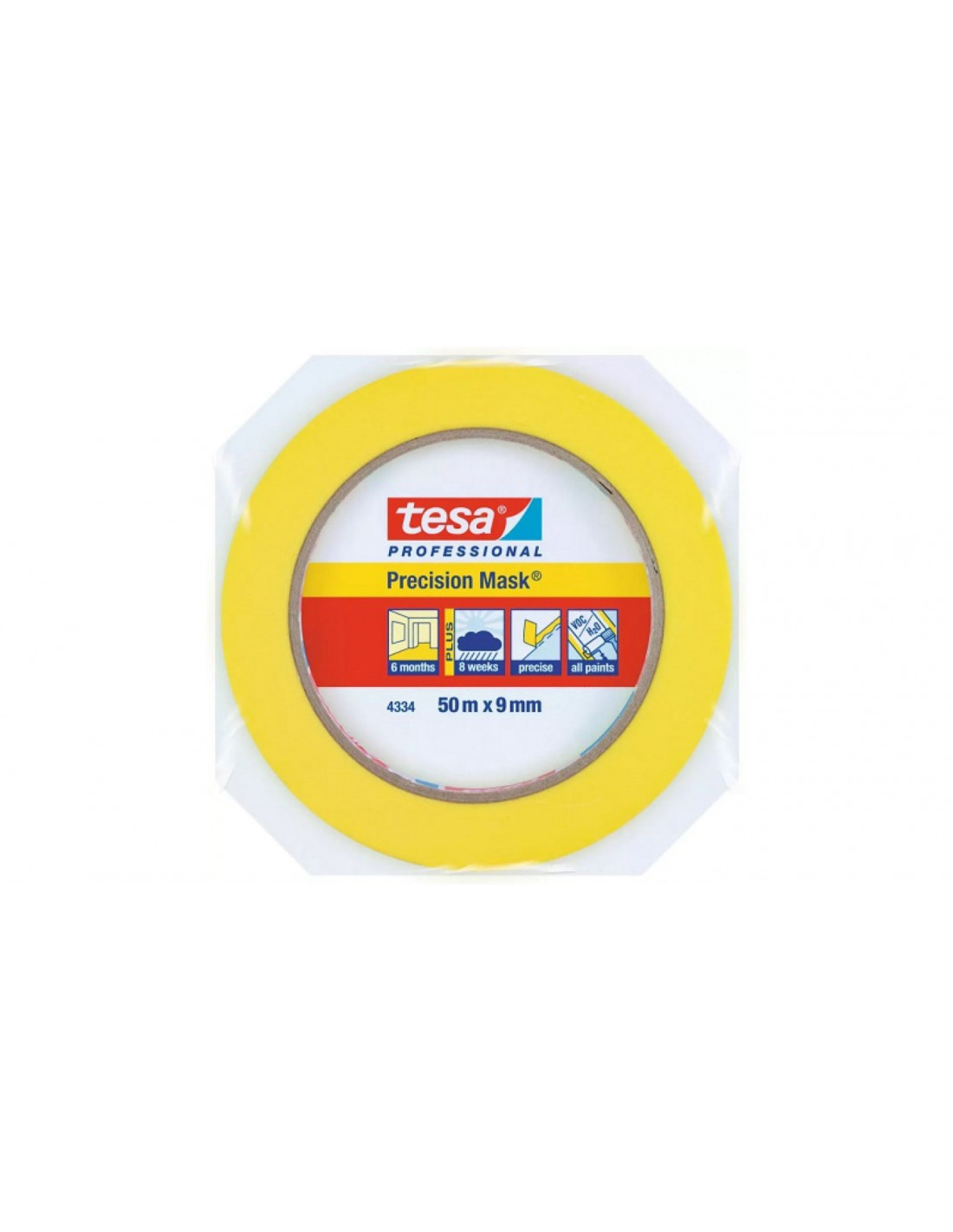 Taśma maskująca tesa® Precision Mask® 4334 gwarantuje ostre krawędzie malarskie. Dzięki idealnej kombinacji specjalnego, elastycznego nośnika i doskonale zbalansowanej akrylowej masy klejącej, jest niezwykle łatwa w użyciu. Właściwości te ułatwiają aplikowanie taśmy do powierzchni i zapobiega podciekaniu farby. Połączenie profesjonalnej taśmy malarskiej i wykwalifikowanej wiedzy fachowej, zapewnia doskonałe efekty wykonywanych prac malarskich. Ponadto wysoka jakość taśmy malarskiej pozwola zaoszczędzić na kosztownych poprawkach malarskich. Taśma tesa® Precision Mask® 4334 jest również zalecana do maskowania podczas malowania natryskowego, a następnie do suszenia w piecu do 120°C/30min. Ze względu na cienki i podłużny nośnik idealnie nadaje się do maskowania dwutonowego, np. do uzyskania prostych i długich linii.