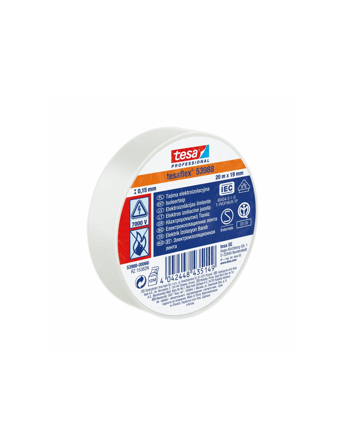 Taśma elektroizolacyjna 5000V PVC 20m 19mm biała 53988-00066-00