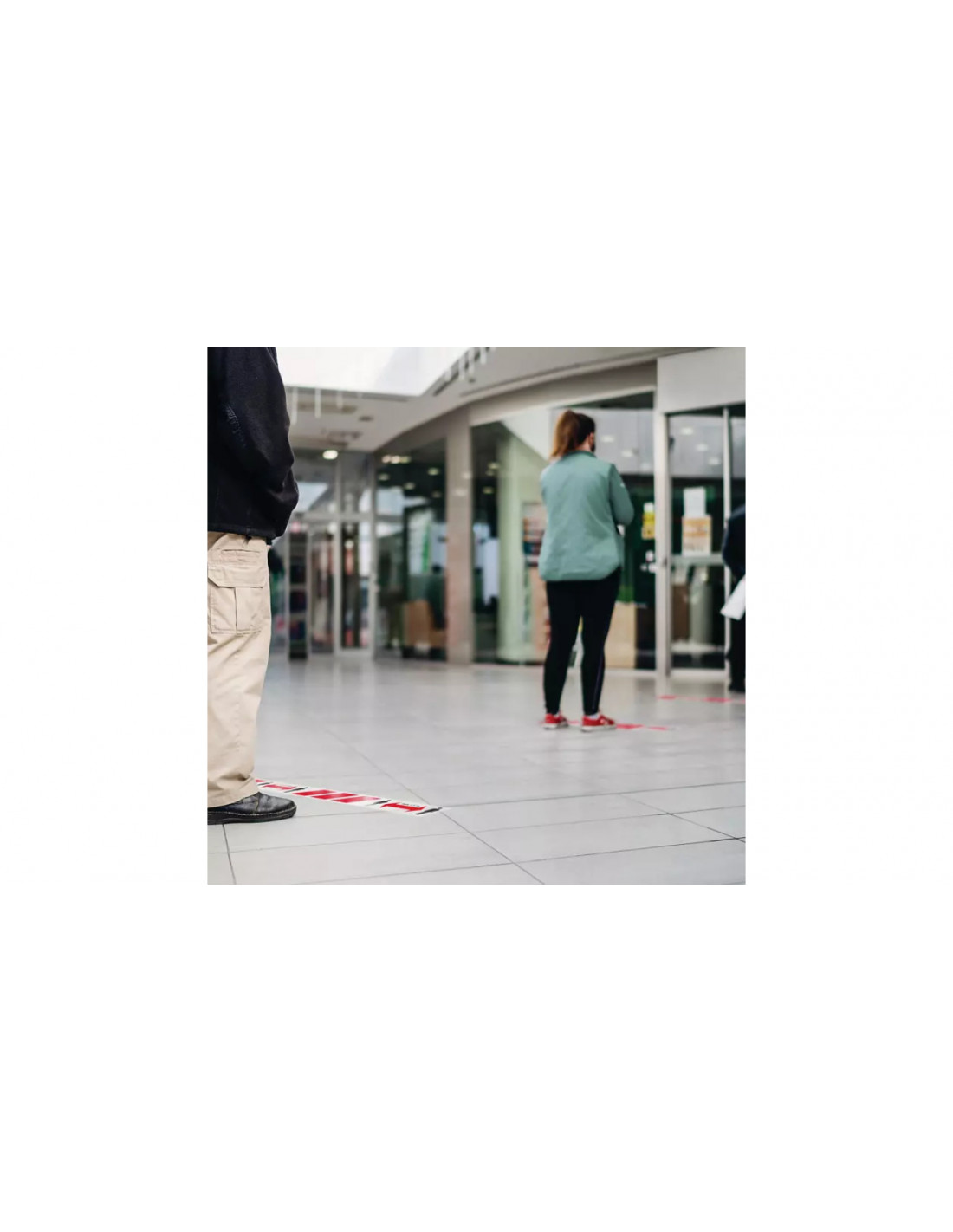 W czasie pandemii koronawirusa bardzo istotne jest zachowywanie dystansu społecznego. Ułatwia to nasza biało-czerwona taśma dystansująca, umożliwiająca szybkie i proste znakowanie podłóg. Napis na taśmie przypomina o konieczności zachowania dystansu 1,5 m.