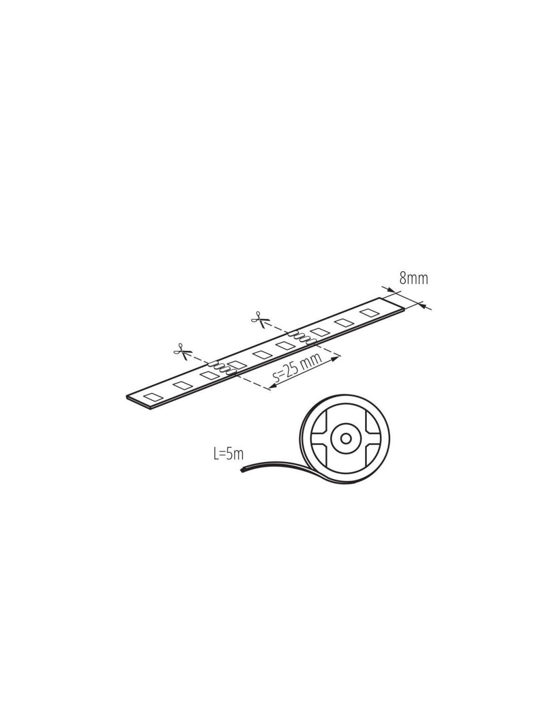 Taśma LED, Długość [mm]: 5000, Głębokość [mm]: 1, Szerokość [mm]: 8, Wysokość [mm]: 5000, Barwa światła: chłodnobiała, Ilość cykli wł/wył: ≥10000, Jednolitość barw [SDCM]: 6, Klasa ochronności przed porażeniem elektrycznym: III, Miejsce zastosowania: wewnątrz, Minimalna odległość od oświetlanego obiektu: 0,1m, Moc znamionowa [W]: 1m = 9,6, Napięcie znamionowe [V]: 12 DC, Rodzaj diody: LED SMD, Rodzaj przyłącza: wolne końce przewodów, Stopień IP: 00, Strumień świetlny oprawy [lm]: 1m = 1080, Temperatura barwowa [K]: 6500, Trzonek: wires, Współczynnik oddawania barw Ra: 80, Zakres temperatury otoczenia, na którą może być narażony wyrób [°C]: 5÷25, Zawartość rtęci: nie, Znamionowa trwałość lampy [h]: 15000, Zastosowana technologia oświetleniowa: LED, Bezkierunkowe lub kierunkowe źródło światła: NDLS, Źródło światła zasilane lub niezasilane napięciem sieciowym: NMLS, Połączone źródło światła (CLS): nie, Źródło światła z możliwością zmiany barwy światła: nie, Źródło światła o wysokiej luminancji: nie, Osłona przeciwolśnieniowa: nie, Funkcja ściemniania: nie, Zużycie energii w trybie włączenia (kWh/1000h): 5, Klasa efektywności energetycznej: F, Użyteczny strumień świetlny źródła światła Φuse [lm]: 0,5 = 540, Użyteczny strumień świetlny źródła światła Φuse [lm]: w kuli (360°), Moc w trybie włączenia Pon [W]: 0,5m = 4,8.