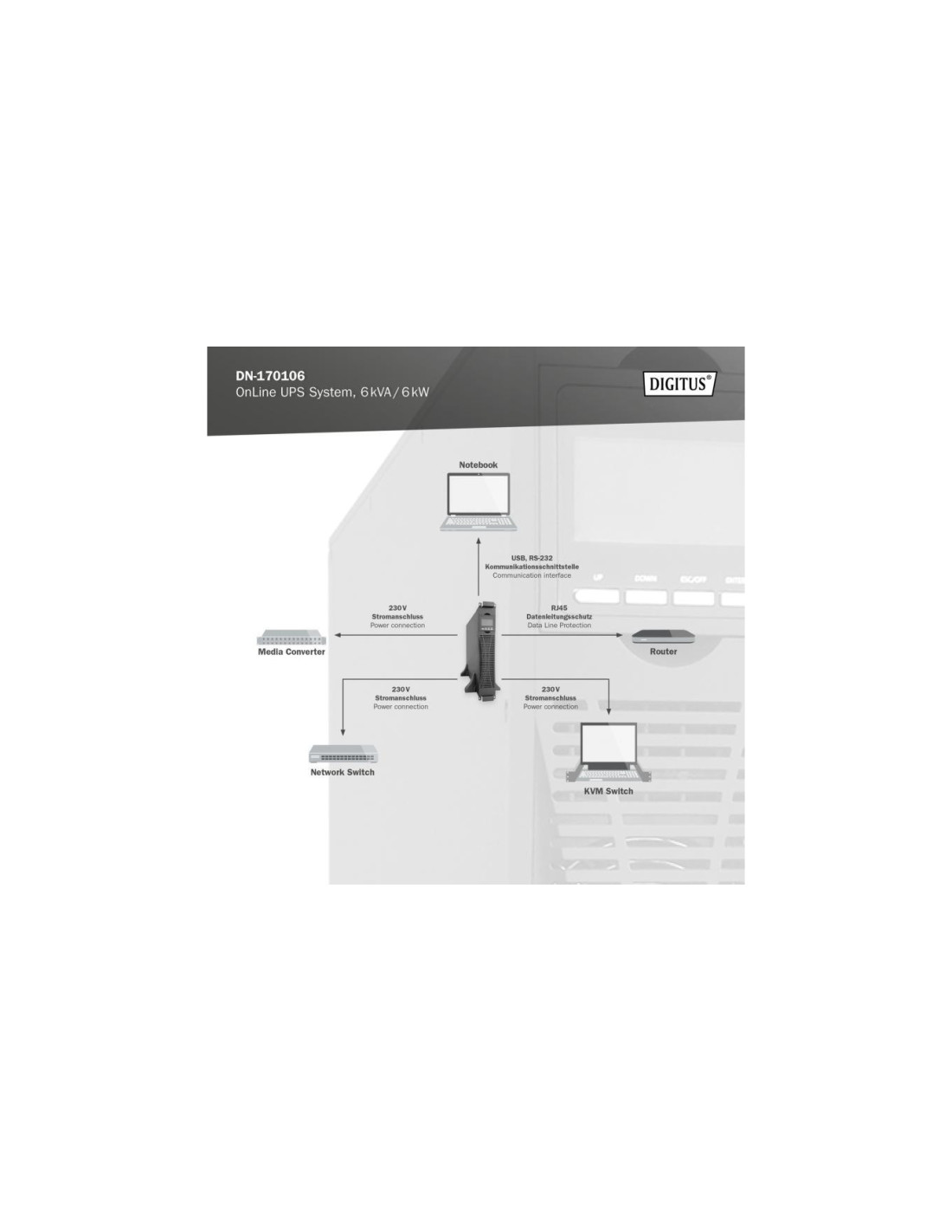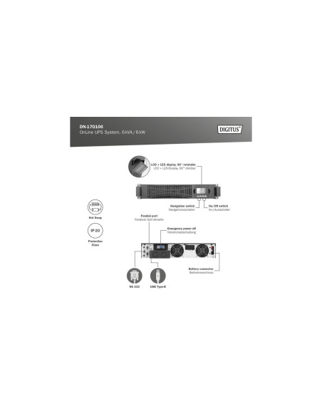 Systemy UPS DIGITUS® OnLine to niezawodne rozwiązania, które zostały opracowane z myślą o ochronie wrażliwych urządzeń w zastosowaniach przemysłowych przed przerwami w dopływie prądu. Są one wyposażone w mikroprocesory sterujące dla zagwarantowania najwyższej wydajności i bezpieczeństwa. Można równolegle podłączyć maks. UPS nie posiada wewnętrznych baterii, należy je zamówić oddzielnie jako zewnętrzne moduły bateryjne (numer artykułu: DN-170108). Można podłączyć maksymalnie 4 zewnętrzne moduły bateryjne. UPS można połączyć z odpowiednimi zewnętrznymi modułami baterii. Dzięki wysokiemu współczynnikowi mocy, szerokiemu zakresowi napięcia wejściowego oraz wydajnej ładowarce system spełnia najwyższe wymagania. Inteligentne tryby ładowania i sterowania prędkością obrotową wentylatorów wydłużają żywotność i niezawodność UPS. Za pomocą wyświetlacza LCD można skonfigurować wszystkie ustawienia parametrów tego zasilacza awaryjnego, dzięki czemu UPS firmy DIGITUS® jest cennym rozszerzeniem Twojej infrastruktury IT. Adapter SNMP do zdalnego dostępu do systemu UPS jest dostępny opcjonalnie.