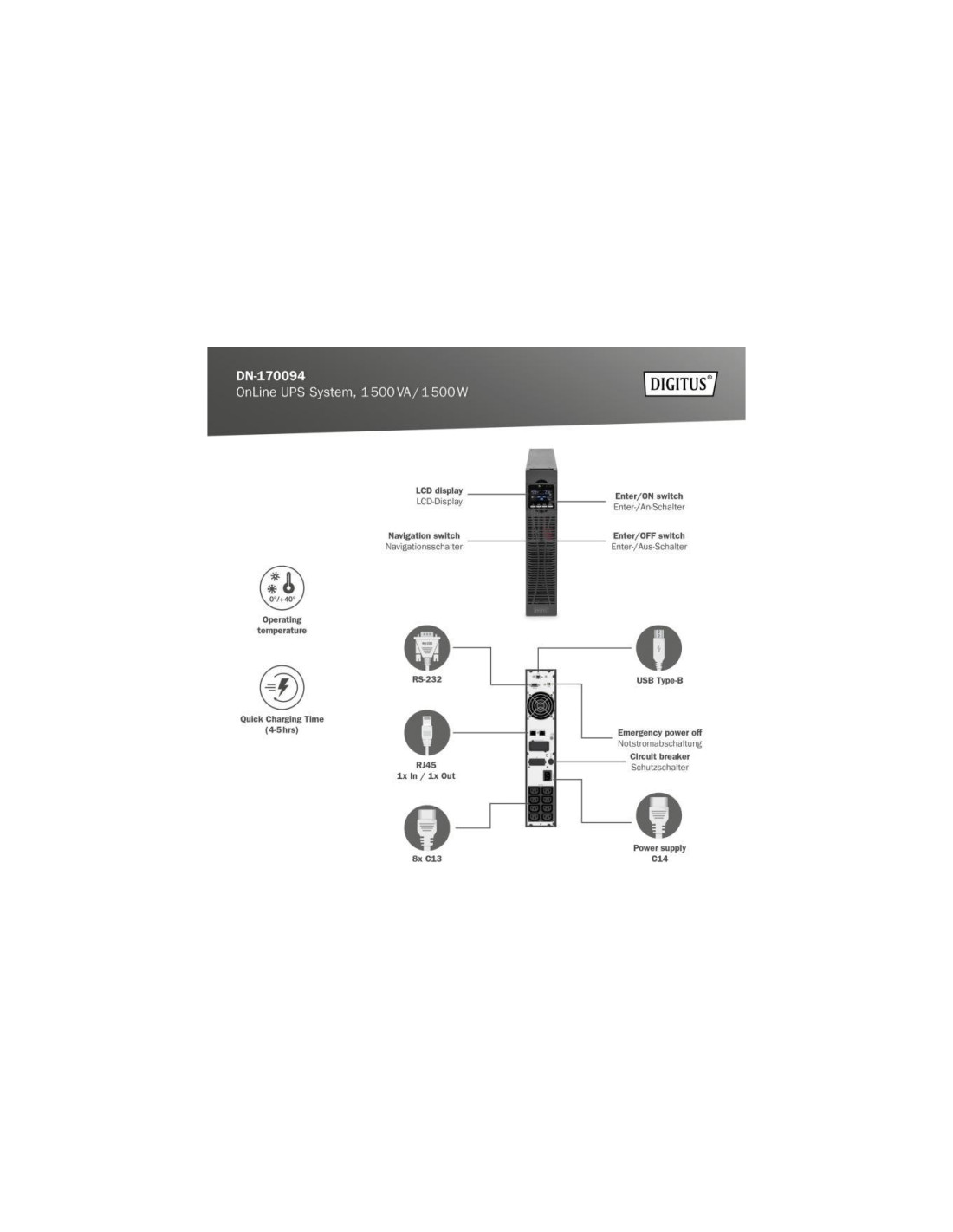 Systemy UPS OnLine firmy DIGITUS® to wyjątkowo niezawodne rozwiązania, które zostały opracowane z myślą o ochronie wrażliwych urządzeń przed przerwami w dopływie prądu. Są one wyposażone w mikroprocesory sterujące dla zagwarantowania najwyższej wydajności i bezpieczeństwa systemów firmowych i biurowych użytkownika, a także ochrony przed utratą danych i ewentualnymi szkodami. Dzięki wysokiemu współczynnikowi mocy, szerokiemu zakresowi napięcia oraz wydajnej ładowarce system nadaje się również do zastosowań o wysokich wymaganiach. Inteligentne tryby ładowania i sterowania prędkością obrotową wentylatorów wydłużają żywotność i zwiększają niezawodność UPS. Za pomocą wyświetlacza LCD można skonfigurować wszystkie ustawienia parametrów tego zasilacza awaryjnego dla zapewnienia nieprzerwanego zasilania elektrycznego. Adapter SNMP do zdalnego dostępu do systemu UPS jest dostępny opcjonalnie.