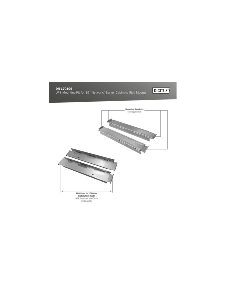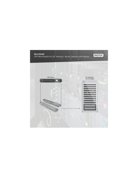 Za pomocą tego zestawu montażowego można zintegrować systemy UPS w szafach sieciowych lub serwerowych DIGITUS® 483 mm (19″). Można zainstalować systemy zasilania awaryjnego o wysokości montażowej 2U lub 3U, rozwiązanie jest kompatybilne z urządzeniami UPS OnLine DIGITUS® (1 K – 10 K). Montaż jest wykonywany na 4 szynach profilowych szafy serwerowej 19″.