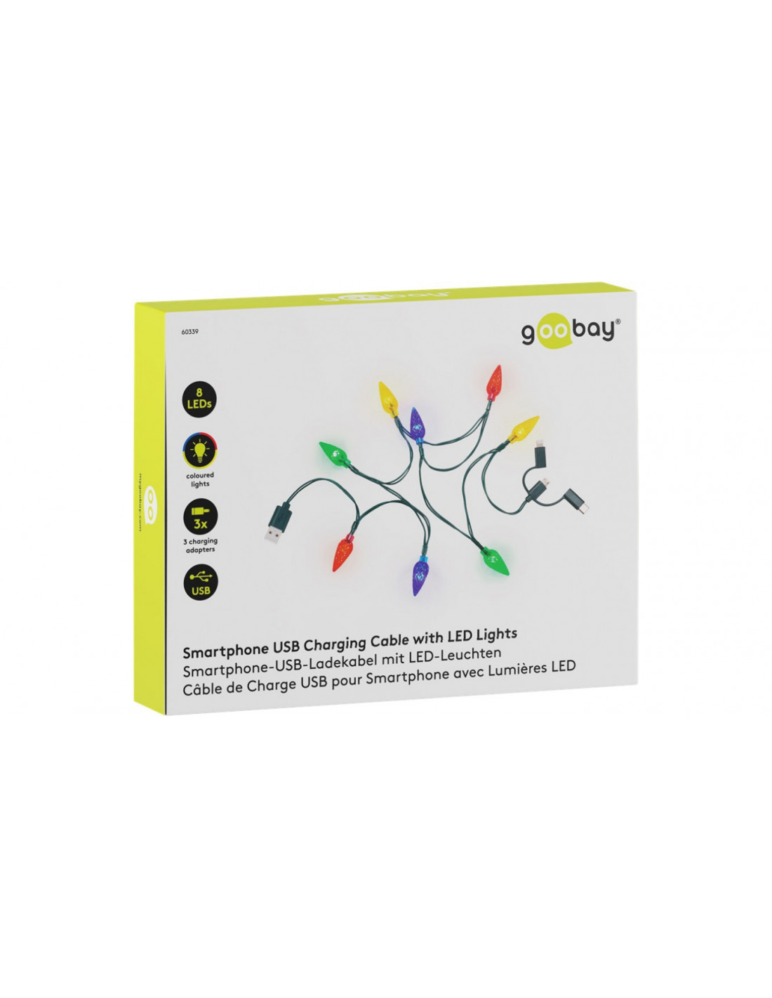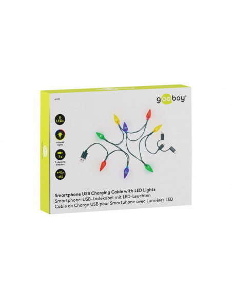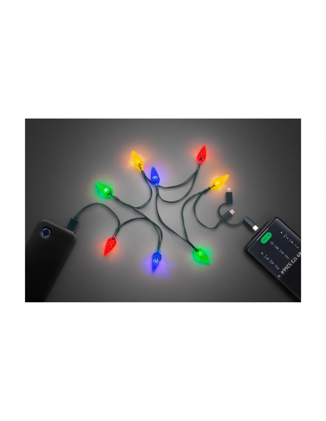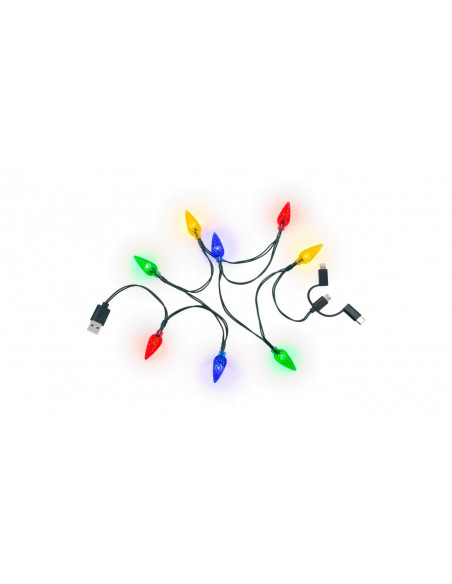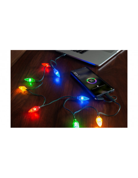 kabel do ładowania o długości 90 cm z 8 żarówkami w jaskrawych kolorach (czerwonym, żółtym, niebieskim i zielonym) i odstępem między diodami wynoszącym 10 cm