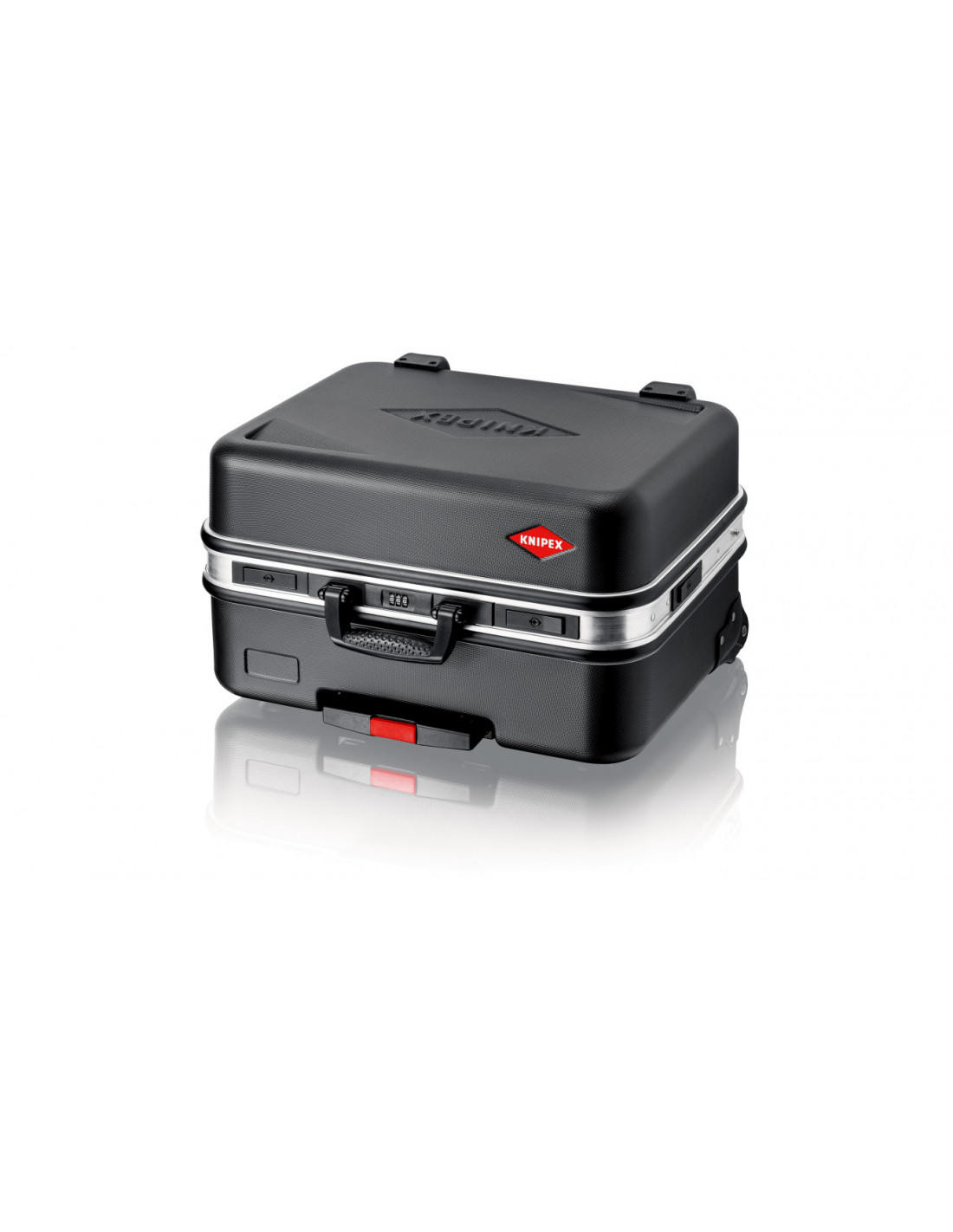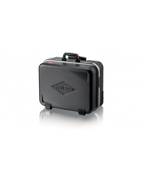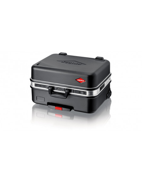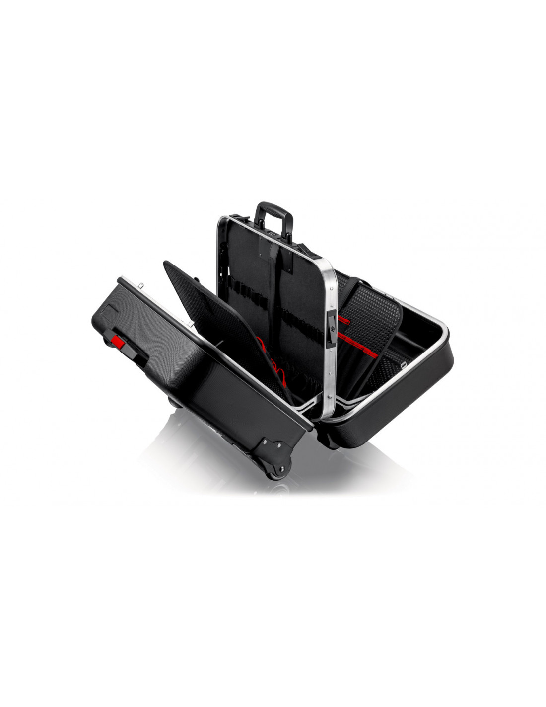 Rama aluminiowa po obwodzie z solidnie zamocowaną, stabilną ścianką środkową, którą można wyposażyć w narzędzia po obu stronach, z uniwersalnymi możliwościami uzupełniania wyposażenia walizki dzięki elastycznym uchwytom pętelkowym i dwunastu małym kieszonkom