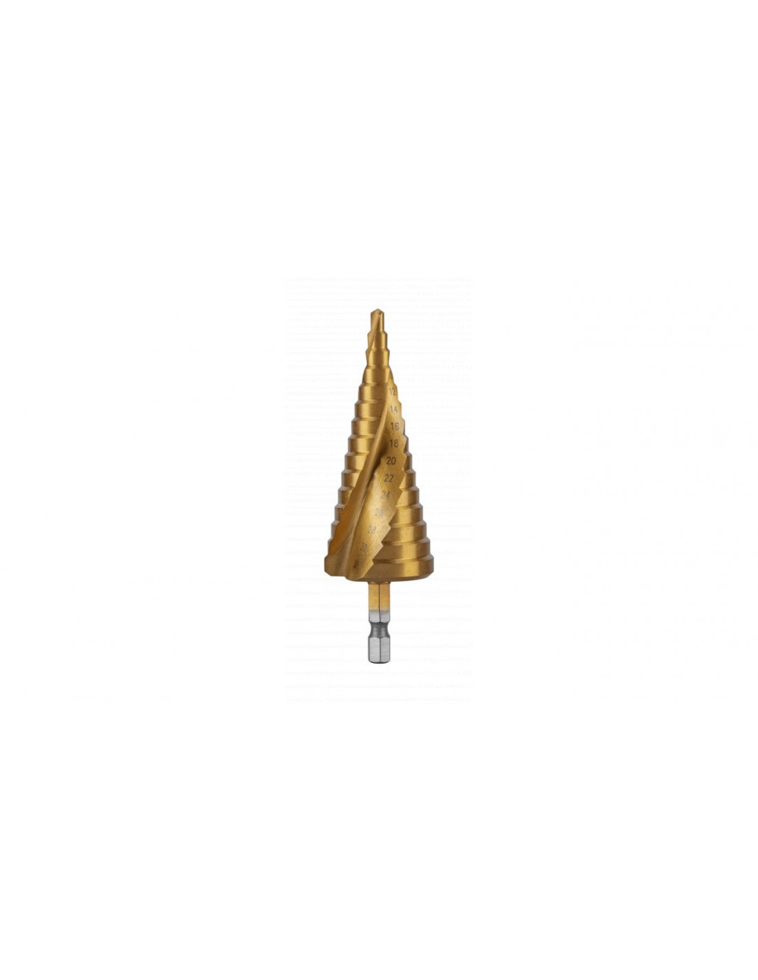 Wiertło stopniowe spiralne przystosowane do wiercenia w różnych rodzajach stali, metalach nieżelaznych, tworzywach sztucznych oraz drewnie. Umożliwia wiercenie precyzyjnych otworów. Wiertło posiada spiralne rowki tnące, które są jedną z najefektywniejszych technologii stosowanych w wiertłach stopniowych i pozwalają na znacznie szybsze i efektywniejsze wiercenie otworów, których krawędzie pozostają precyzyjnie wygradowane. Znajdzie zastosowanie w zakładach blacharskich, warsztatach samochodowych czy w pracy instalatorów i elektryków. Do użytku profesjonalnego.