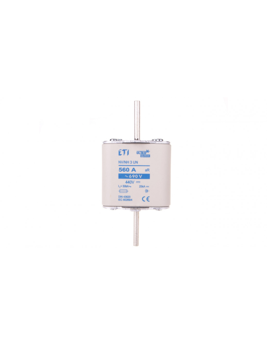 ETI ELEKTROELEMENT jest firmą macierzystą marki ETI-Polam. Firma od ponad 50 lat działa na rynku elektrotechnicznym i z roku na rok zyskuje coraz większą liczbę zadowolonych klientów. Korporacja do produkcji swoich urządzeń używa wyłącznie nowoczesnych technologii, a wszystko dzieje się pod czujnym okiem najlepszych specjalistów z branży. Jej główny asortyment produkcji to: wyłączniki nadprądowe i ochronne różnicowoprądowe, bezpieczniki topikowe wszystkich wielkości i charakterystyk zarówno niskiego jak i średniego napięcia, ceramika elektrotechniczna itp.Dana wkładka bezpiecznikowa została wyprodukowana w serii Ultra-Quick marki ETI. Charakterystyka aR, oznacza charakterystykę niepełnozakresową, nastawioną na ochronę półprzewodników. Napięcie znamionowe 1 oraz 2 w tym osprzęcie osiąga 690 V, natomiast prąd znamionowy jest równy 560 A. Wskaźnikiem zadziałania w tej wkładce jest wskaźnik górny. Rozmiar w jakim wykonano osprzęt to NH3.
