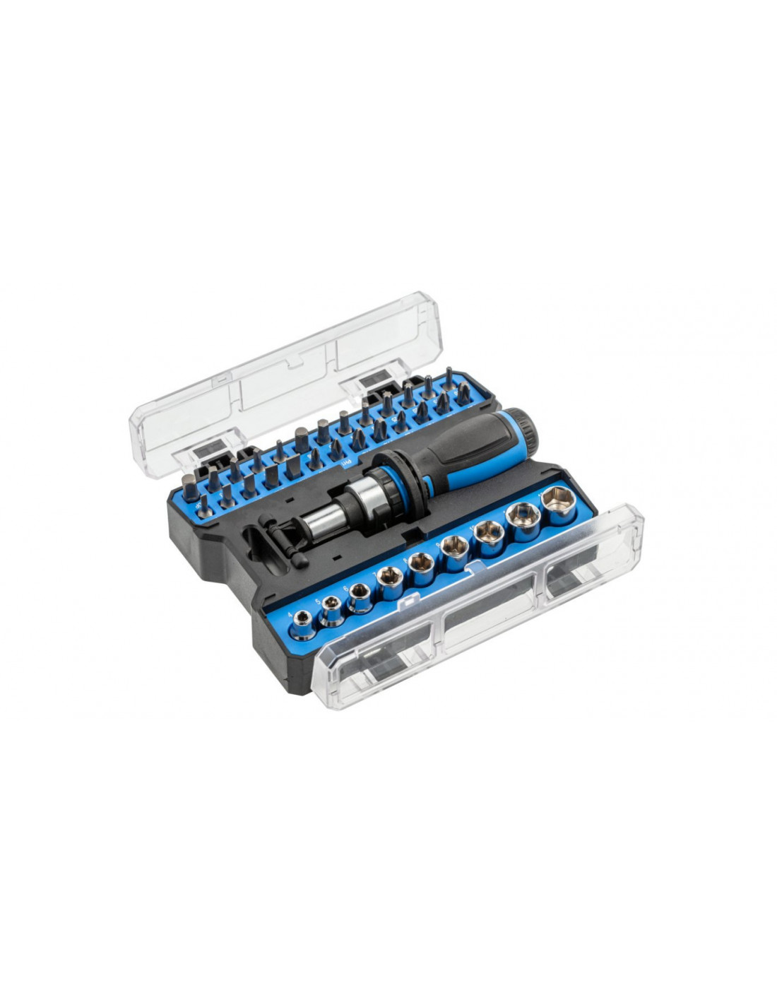 Zestaw składający się z wkrętaka z grzechotką oraz 25 końcówek wkrętakowych i 9 nasadek. Całość zapakowana w praktyczny organizer ułatwiający przechowywanie. Niezbędny każdemu profesjonaliście.