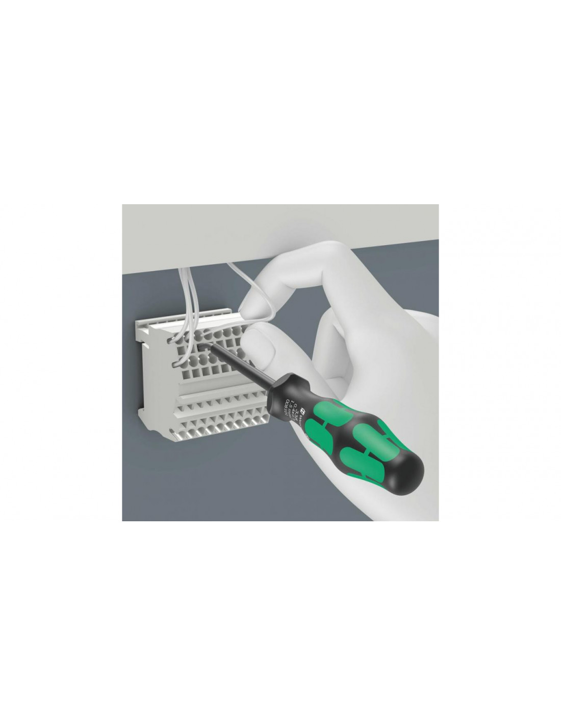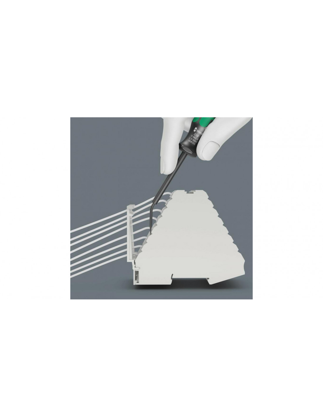 Praktyczne narzędzie do zacisków sprężynowych. Zakrzywiony trzpień ułatwia również pracę przy zaciskach sprężynowych w skrzynkach rozdzielczych, do których nie można dotrzeć przy pomocy prostego trzpienia. Trzpień pozostaje w zacisku, a użytkownik może wprowadzać kabel dwoma rękoma. Wielokomponentowa rękojeść Kraftform do szybkiej i bezpiecznej pracy.