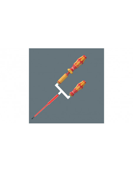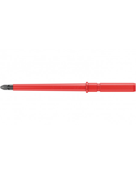Trzpień wymienny izolowany VDE systemu Wera Kraftform Kompakt VDE - szybka wymiana trzpieni bez użycia narzędzi. Każde narzędzie testowane pojedynczo zgodnie z IEC 60900. Indywidualnie kontrolowana izolacja pod napięciem 10000 V gwarantuje bezpieczeństwo pracy pod napięciem 1000 V. Końcówka Black Point zapewnia dokładne dopasowanie wkrętaka do gniazda wkrętu oraz zwiększoną odporność na korozję.