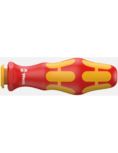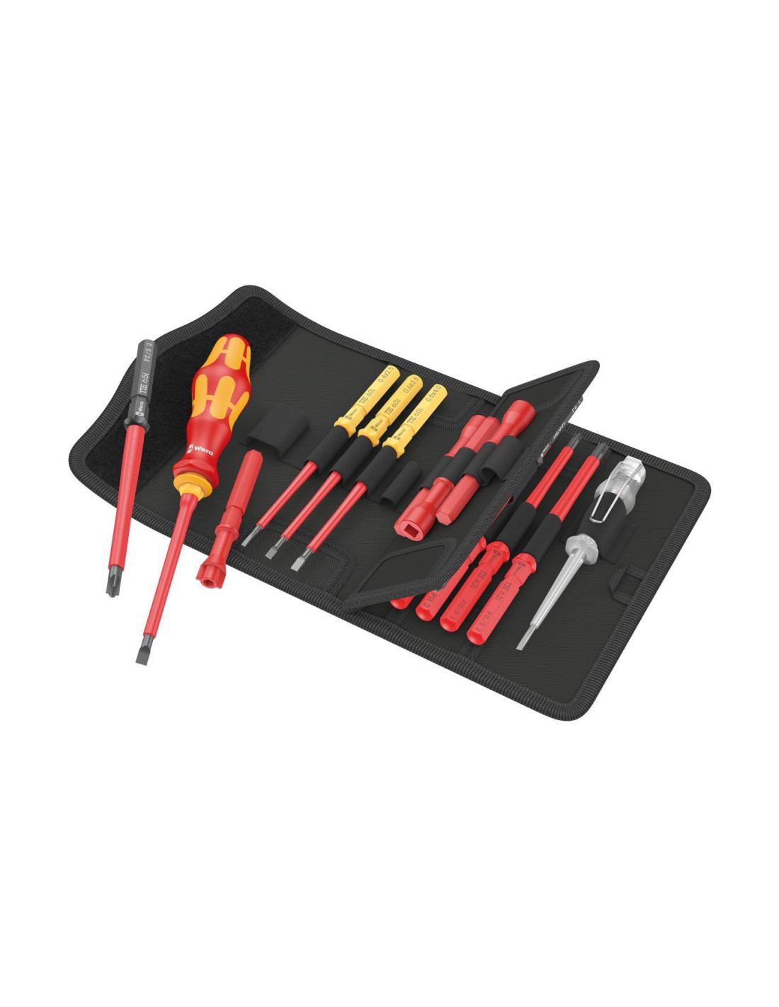 Rękojeść z uchwytem na trzpienie wymienne 817 VDE Kraftform, 12 trzpieni wymiennych VDE z systemem wyszukiwania narzędzi Take it easy: oznaczenie kolorystyczne według profilu i laserowe oznaczenie rozmiaru ułatwiające i przyspieszające odnajdywanie właściwego narzędzia, 4 klucze do szaf sterowniczych, 1 jednobiegunowy próbnik napięcia.