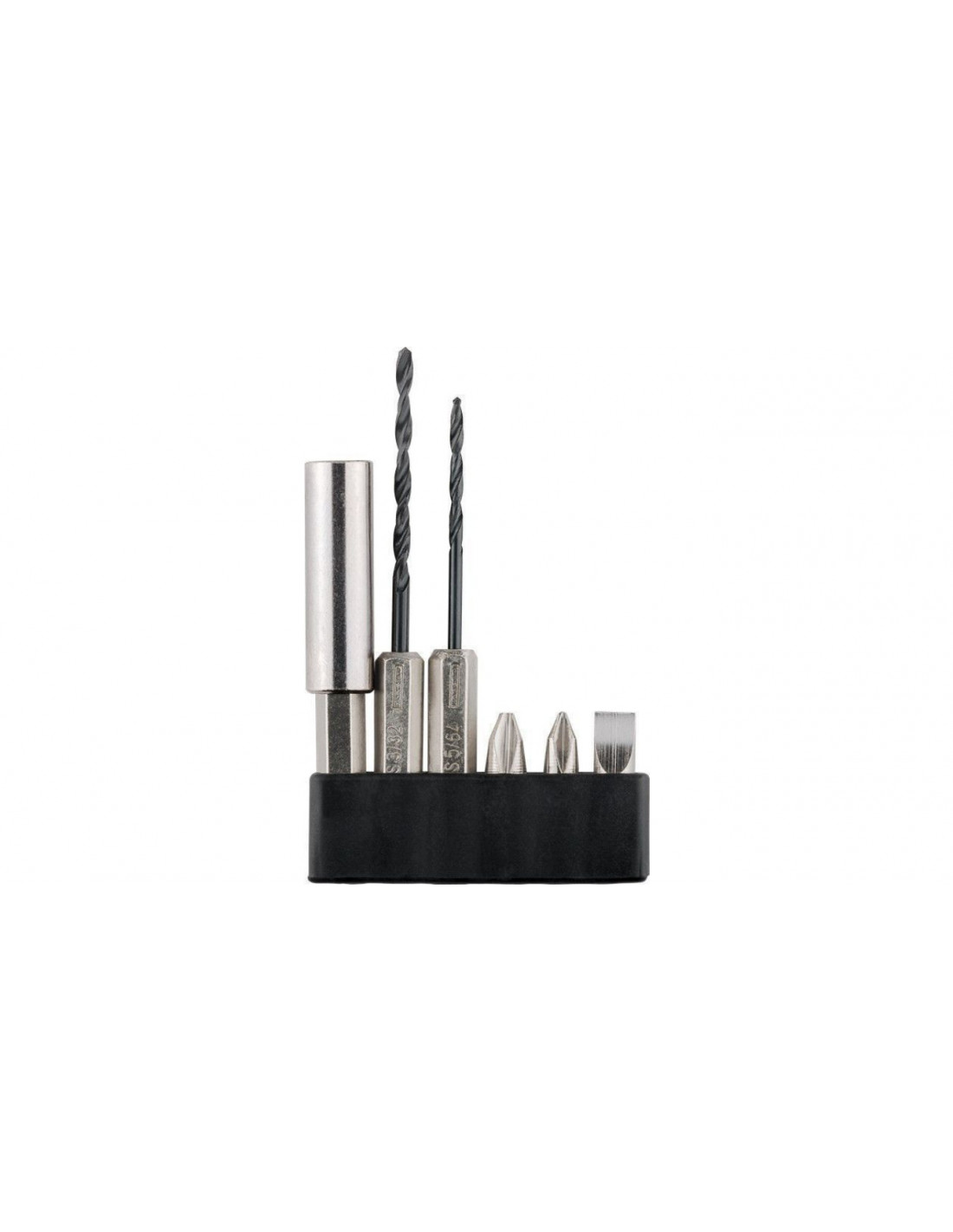 w zestawie 3 bity CrV 25 mm, 1 rozszerzenie bitowe, 2 wiertarka oraz 5/64 (2 mm), 3/32 (2,5 mm) i ładowarka sieciowa