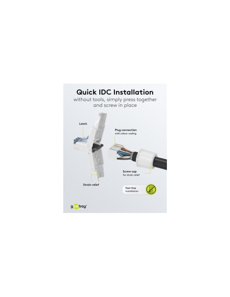 Do szybkiego montażu na kablach sieciowych bez użycia narzędzi, po prostu ściskając obudowę złącza i przykręcając odciążenie naprężenia