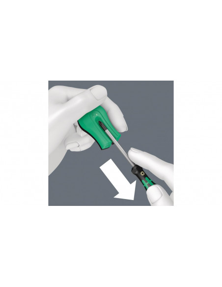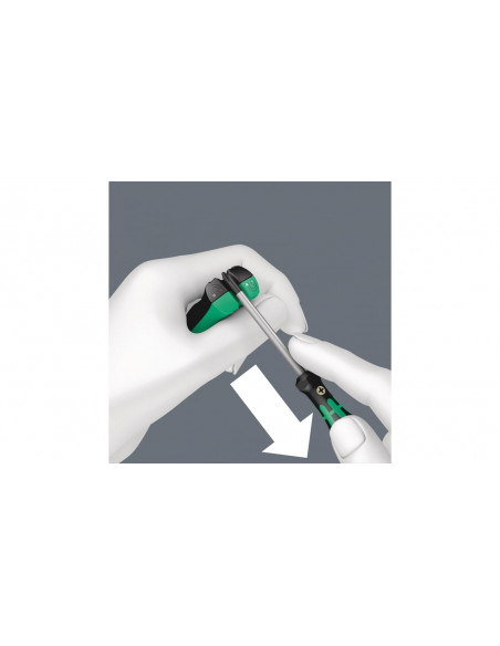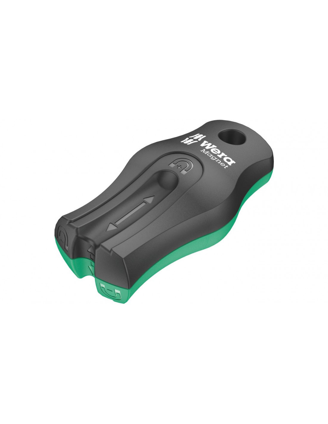 Magnetyzer Wystarczy przeciągnąć narzędzie wzdłuż strony z biegunem dodatnim, a narzędzie pewnie przytrzyma śrubę na trzpieniu. Aby rozmagnetyzować narzędzie, przeciągnij je wzdłuż strony magnetyzera Wera z biegunem ujemnym.