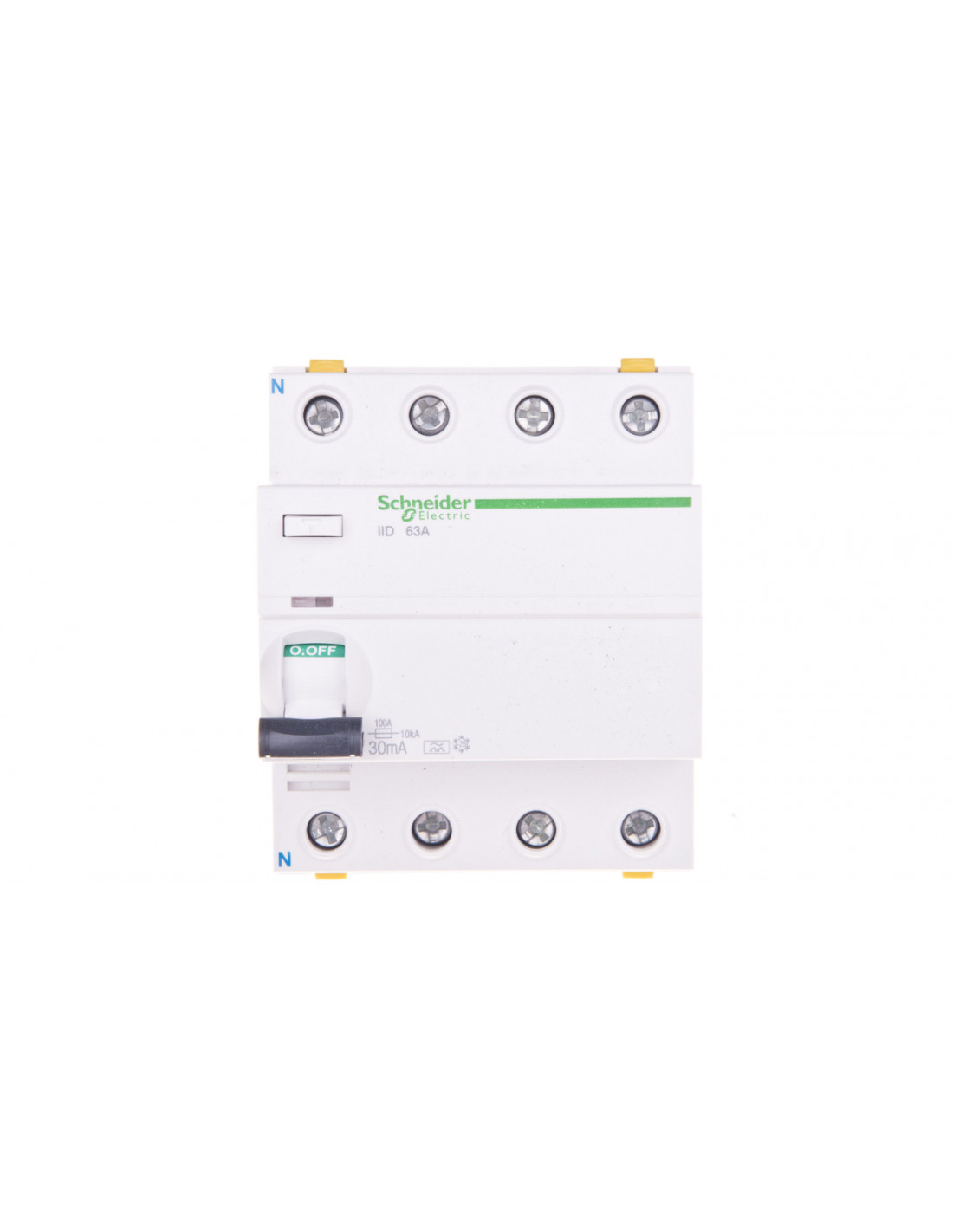 Prezentowany wyłącznik różnicowoprądowy pochodzi z serii Acti 9 marki SCHNEIDER ELECTRIC. Jego czułość została oznaczona literą A. Częstotliwość przy jakiej pracuje to 50/60 Hz. Głębokość wbudowana tego wyłącznika wynosi 70 mm. Jest on 4-biegunowy i posiada 8 modułów. Wymiar obudowy (zgodnie z DIN 43880) został oznaczony na 8. Napięcie znamionowe 1 osiąga 400 V, natomiast napięcie znamionowe 2 - 415 V. Wyłącznik nie posiada ochrony selektywnej i wyzwalania krótkozwłocznego. Odporność na udar prądowy wynosi 0,25 kA. Prąd znamionowy w tym urządzeniu osiąga 63 A. Wyłącznik można zamontować na szynie DIN. IP20, to stopień ochrony jakim się charakteryzuje. Urządzenie będzie odporne na ciała obce o średnicy 12,5 mm, nie jest jednak chronione przed szkodliwym działaniem wody i wilgoci. Znamionowa zdolność zwarciowa wynosi 1,5 kA, natomiast znamionowy prąd różnicowy ma 0,03 A. Dany wyłącznik można dodatkowo wyposażyć. Produkcją zajął się znany i ceniony producent - SCHNEIDER ELECTRIC. Firma posiada ponad 170-cio letni staż na rynku rozdziału energii elektrycznej. Aparatura posiada wszelkie certyfikaty, które pozwalają na pracę nawet w najcięższych warunkach.