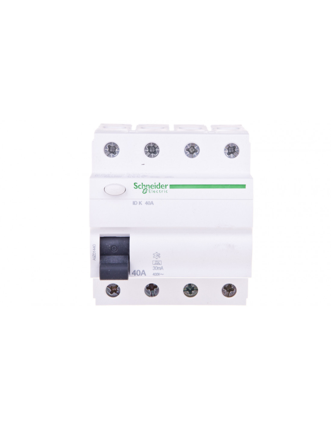 Prezentowany wyłącznik różnicowoprądowy jest 4-biegunowy. Jego czułość została określona literą A. Częstotliwość przy jakiej pracuje wynosi 50 Hz. Głębokość wbudowana wynosi 69,5 mm. Wyłącznik posiada ochronę selektywną, nie ma jednak wyzwalania krótkozwłocznego. Napięcie znamionowe osiąga 230 V. Prąd znamionowy jest równy 40 A. Odporność na udar prądowy wynosi 3 kA. Wytrzymałość zwarciowa wynosi 10 kA. Wyłącznik można zamontować na szynie DIN. Posiada 2 moduły. Wymiar obudowy (zgodnie z DIN 43880) został oznaczony cyfrą 1. IP20, to stopień ochrony nadany przez producenta. Wyłącznik nie może pracować na zewnątrz budynków, ponieważ nie jest chroniony przed działaniem wody i wilgoci. Posiada ochronę przed ciałami obcymi o średnicy 12,5 mm oraz większymi. Znamionowy prąd różnicowy dochodzi do 0,03 A, natomiast znamionowa zdolność zwarciowa wynosi 0,5 kA. Istnieje możliwość dodatkowego wyposażenia urządzenia. Pochodzi on z renomowanej serii Acti9, którą wyprodukował SCHNEIDER ELECTRIC - lider na wymagającym rynku rozdziału energii elektrycznej. SCHNEIDER produkuje urządzenia w pełni bezpieczne i najlepszej jakości.