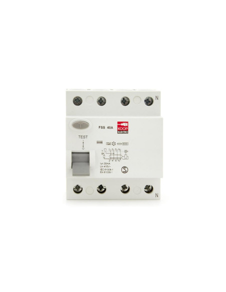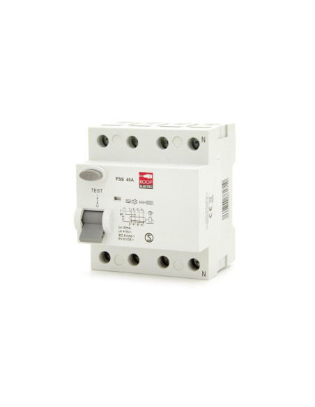 Wyłącznik różnicowoprądowy (różnicówka) KOOP Elektro FSS 4P 40A typ A to elektryczne urządzenie zabezpieczające, które rozłącza obwód po wykryciu, że prąd elektryczny z niego wypływający nie jest równy prądowi wpływającemu.