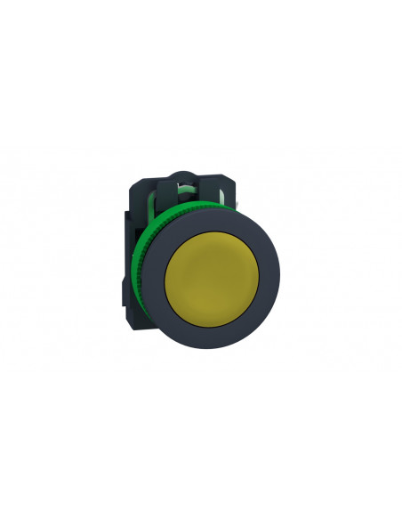 Ten przycisk do montażu płaskiego jest częścią serii Harmony XB5 z tworzywa sztucznego i stanowi kompletny produkt. Ten przycisk do montażu płaskiego jest częścią serii Harmony XB5 z tworzywa sztucznego i stanowi kompletny produkt Średnica montażowa wynosi 30,5 mm. Nie posiada żadnych oznaczeń. Dostępna jest opcja indywidualnego znakowania za pomocą narzędzia do personalizacji dostępnego na stronie internetowej Schneider Electric. Ulepszona ergonomia i estetyka dzięki konstrukcji do montażu płaskiego. Posiada właściwości antybakteryjne. Typ styku to 1NO wolno działający, a terminal przyłączeniowy to zacisk śrubowy. Mechanizm napędowy jest wyposażony w samoczynny powrót, a mechanizm pchający jest płaski. Główka ma kształt okrągły i jest żółta. Maskownica i kołnierz mocujący są plastikowe. Masa tego przycisku wynosi 37 gramów, wysokość 42 mm, a szerokość 36,6 mm. Prostota instalacji, elastyczność i wytrzymałość sprawiają, że nadaje się on do większości segmentów i zastosowań przemysłowych. IP66, 67, 69 i 69K, typ 13 i 4X, IK03, zapewniają ochronę przed ciałami stałymi, pyłem, wodą i wstrząsami. Posiada certyfikaty EN/IEC, znak CE, UL, CSA, JIS, NEMA oraz certyfikaty morskie. W celu ułatwienia instalacji dostępne są akcesoria, które należy zamówić oddzielnie.