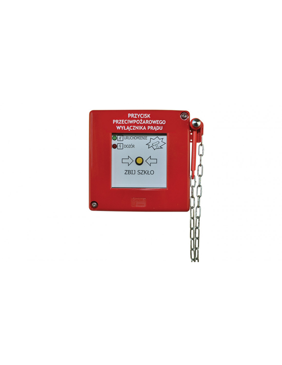 Przycisk przeciwpożarowego wyłącznika prądu jest przyciskiem uruchamianym bezpośrednio typu A (uruchomienie następuje samoczynnie po zbiciu szybki).