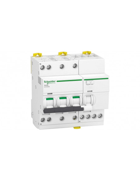 Wyłącznik różnicowoprądowy z wbudowanym zabezpieczeniem nadprądowym Acti9 iCV40 (RCBO) Jest to wyłącznik 3P+N-biegunowy, o prądzie znamionowym 40A oraz charakterystye wyzwalania C. Zabezpieczenie różnicowoprądowe jest typu A o czułości 300mA. Wyłącznik jest o działaniu bezzwłocznym Wytrzymałość zwarciowa Icn wynosi 6000 A zgodnie z EN/IEC 61009-2-1. Aparat chroni przez zwarciami, przeciążeniem przewodów, porażeniem prądem elektrycznym przy dotyku pośrednim oraz przez zagrożeniem pożarowym. 2 unikalne wskaźniki VisiTrip ograniczają czas serwisowania wskazując uszkodzony obwód i rodzaj awarii.