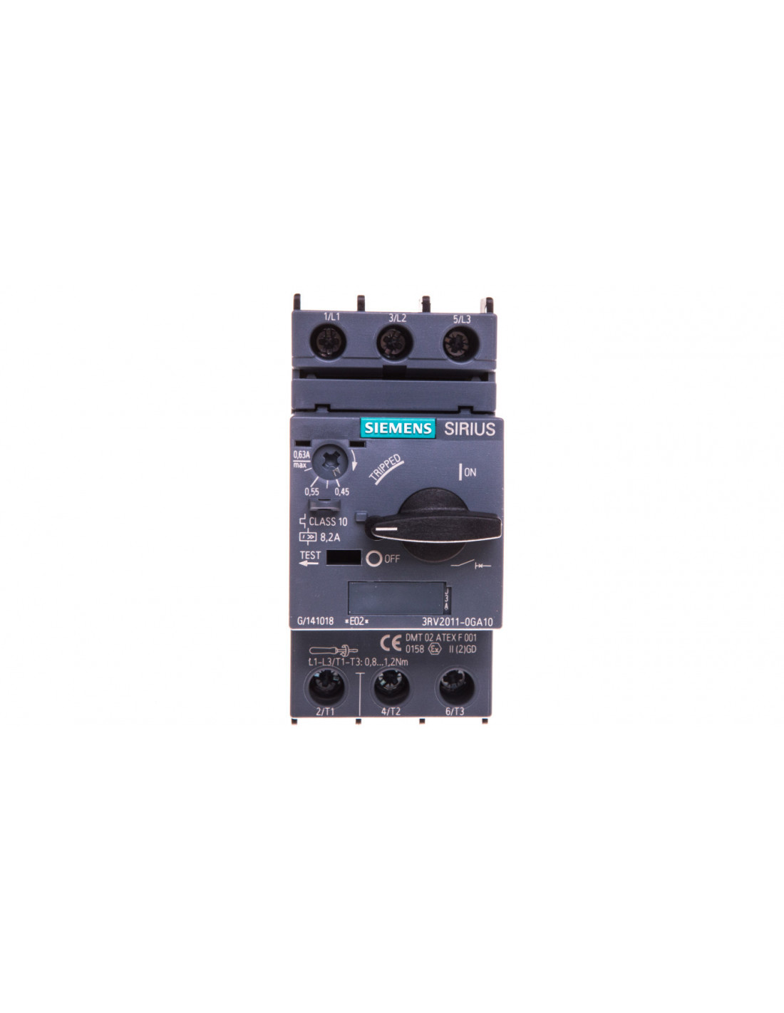 Wyłącznik silnikowy jest elementem, służącym do łączenia, ochrony oraz rozdzielania obwodów prądowych z obciążeniem z silnika. Jest zabezpieczeniem dla silnika przed uszkodzeniami wynikającymi z zablokowania rozruchu, przeciążeń, zwarć, lub w przypadku braku jednej z faz w sieciach trójfazowych. Aparat pochodzi z serii SIRIUS, należącej do czołowego lidera branży elektronicznej- marki SIEMENS. Urządzenie jest typem 3-biegunowym, a jego montaż do obwodu głównego zaleca się wykonać za pomocą połączenia śrubowego. Aparat jest przeznaczony do instalacji na stałe. Model został wykonany na znamionowy prąd ciągły wynoszący 0.63 A, a jego zakres nastawy wyzwalacza przeciążeniowego mieści się w zakresie od 0.45 A do 0.63 A, a znamionowa moc pracy przy AC-3, napięciu wynoszącym 400 V ma wartość 0.18 kW. Znamionowa zwarciowa zdolność łączeniowa przy napięciu 400 V wynosi 100 kA. Urządzenie cechuje się magnetycznym sposobem wyzwalania oraz stopniem ochrony IP20, co znaczy, że urządzenie powinno być stosowane w pomieszczeniach suchych,ponieważ nie jest odporne na działanie wody. Produkt jest stworzony w oparciu o najnowsze rozwiązania technologiczne, spełnia wszystkie wymagane normy bezpieczeństwa i gwarantuje długie i pewne działanie. Jest czuły na zanik jednej fazy w obiegu trójfazowym.