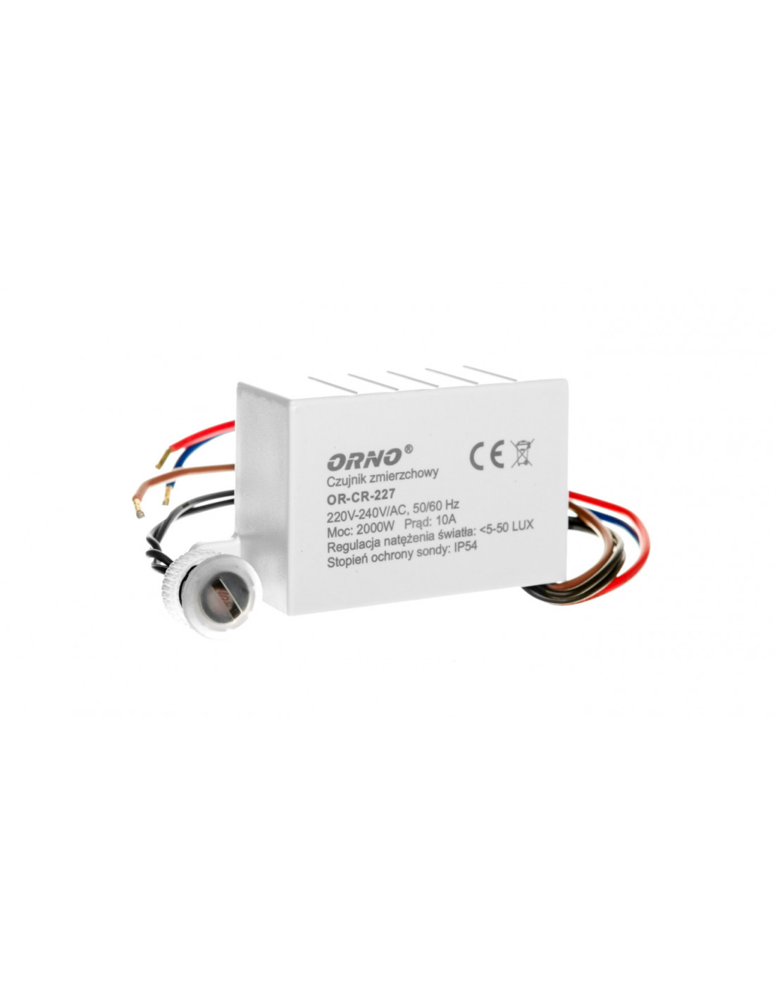 Czujnik zmierzchowy OR-CR-227 to jedna z propozycji katalogowych marki ORNO, znanego producenta m.in. systemów automatyki budynku, systemów domofonowych, wideodomofonowych, oświetleniowych. Urządzenie OR-CR-227 służy do automatycznego sterowania oświetleniem lub innymi odbiornikami elektrycznymi przy jednoczesnej oszczędności energii elektrycznej. Produkt załącza i rozłącza obwód elektryczny, jeśli natężenie oświetlenia spada poniżej określonego wcześniej poziomu.