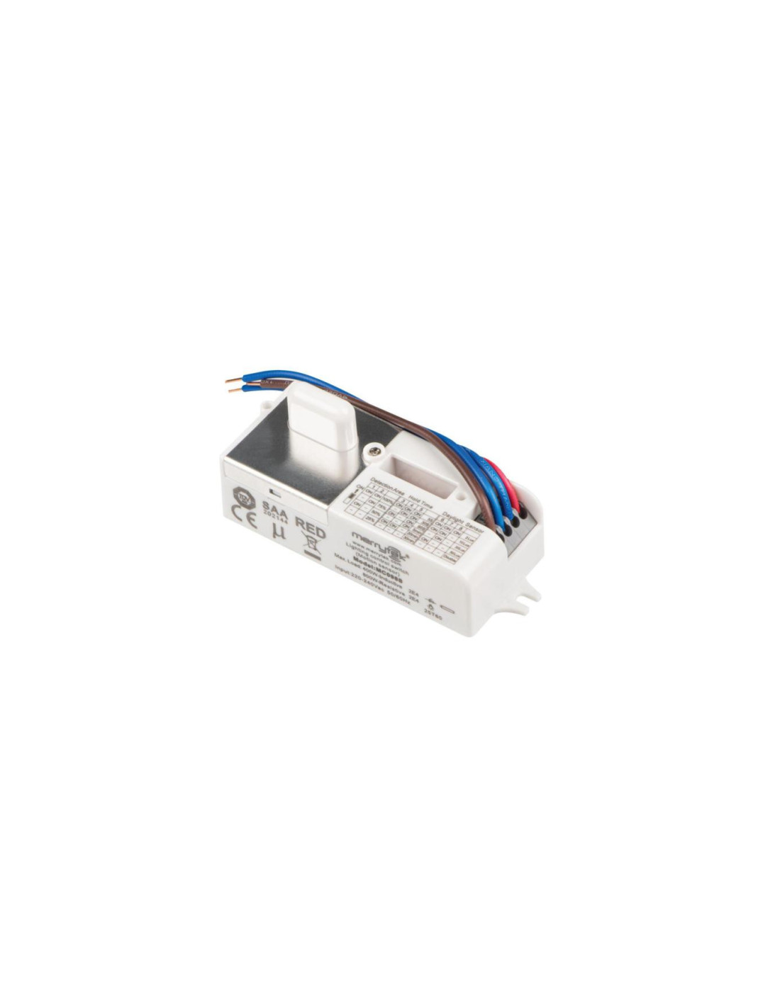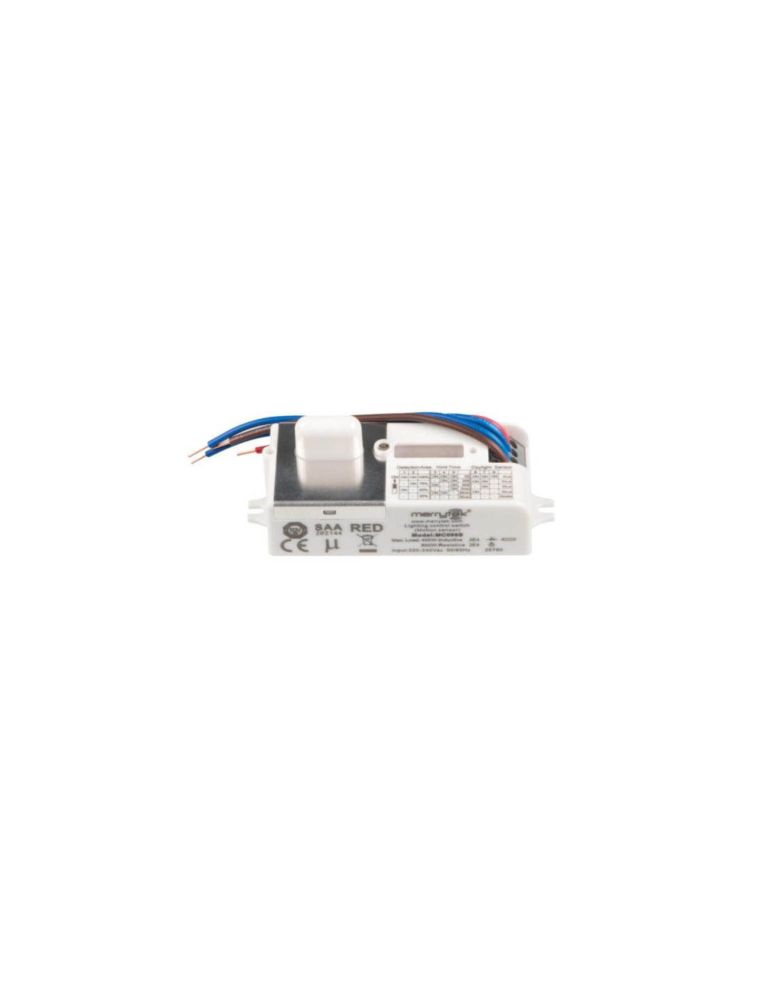 Czujnik ruchu MW, Czas działania czujnika [sekunda-minuta]: 5/30/90-5/20/30, Częstotliwość pracy czujnika [MHz]: 5800, Częstotliwość znamionowa [Hz]: 50, Klasa ochronności przed porażeniem elektrycznym: II, Maksymalny czas działania [min]: 30, Miejsce zastosowania: wewnątrz, Minimalny czas działania [s]: 5, Moc maksymalna [VA]: max 800, Napięcie znamionowe [V]: 220-240 AC, Nastawa poziomu natężenia oświetlenia, przy którym czujnik wykrywa ruch [lx]: 2/10/30/50/disable, Regulacja czułości: 1, Rodzaj czujnika: mikrofalowy, Stopień IP: 20, Zasięg czujnika [m]: max 6.