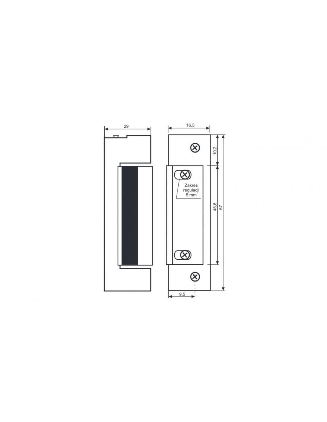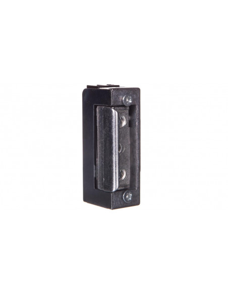 Elektrozaczep uniwersalny /lewy, prawy/ symetryczny. Regulacja języka elektrozaczepu w zakresie 5mm. Elektrozaczep szerokości 16,5mm przeznaczony do stosowania w wąskich profilach.Rozstaw śrub montażowych 52mm.