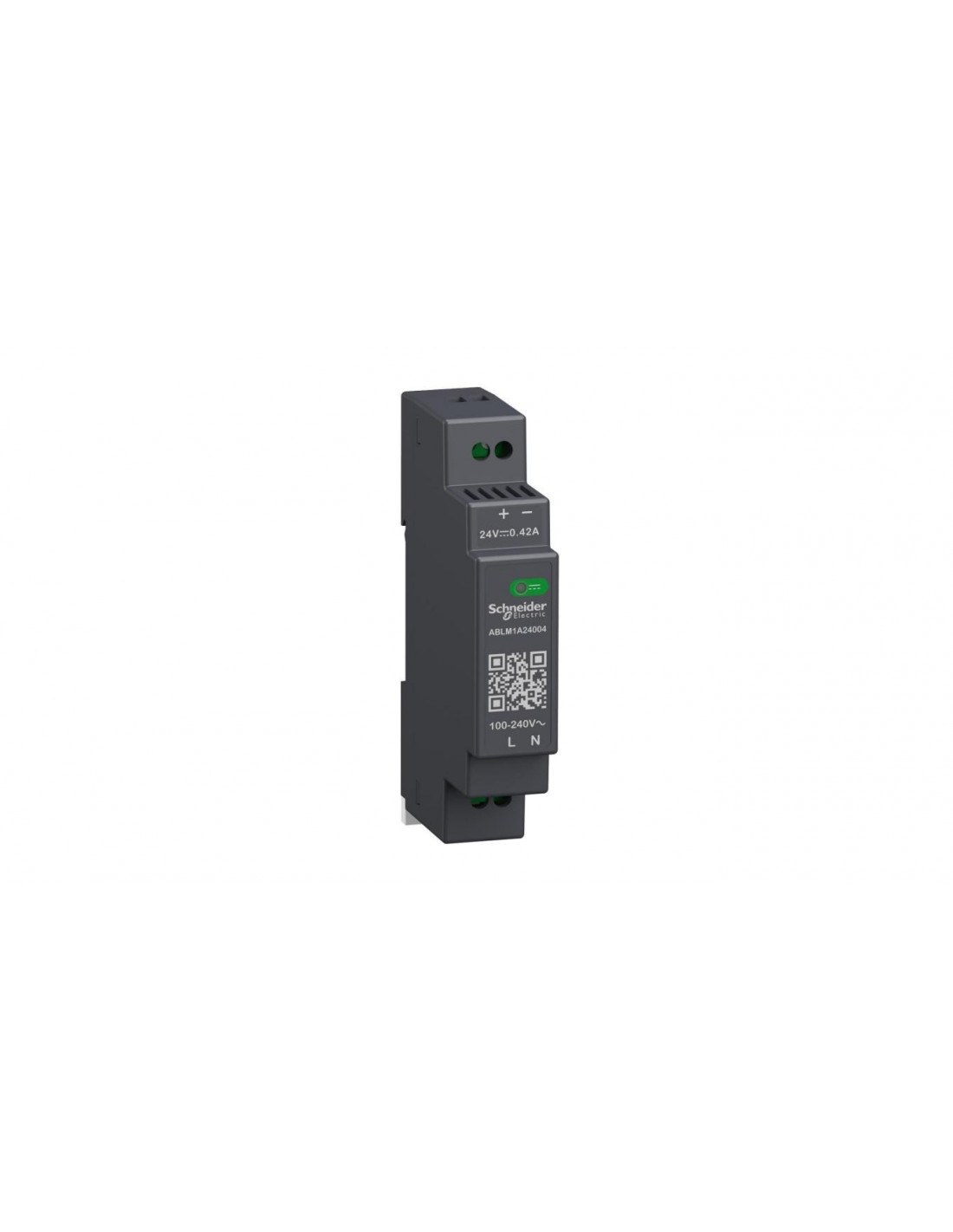 Ten regulowany zasilacz impulsowy (SMPS) ABLM dostarcza napięcie prądu stałego. Posiada znamionowe wejście 100V do 240V AC, znamionowy prąd wyjściowy 0,42A przy 24V DC i znamionową moc wyjściową 10W. Idealnie nadaje się do zasilania napięciem stałym niezbędnym dla urządzeń automatyki przeznaczonych do zastosowań w przemyśle, handlu i mieszkalnictwie, takich jak transport, pakowanie, kontrola, żywność i napoje, górnictwo, olej i gaz oraz woda. Montuje się go na szynie omega lub mocuje za pomocą śruby. Jego szerokość wynosi 18mm, wysokość 91mm, głębokość 55,6mm. Zapewnia ochronę przed przeciążeniami i zwarciami z automatycznym restartem po usunięciu źródła przeciążenia/zwarcia. Jego waga wynosi 0,099 kg. Jest to zasilacz do zastosowań przemysłowych, montaż na szynie. Spełnia normy EN62368-1, ENIEC61010-1/2-201, ENIEC61204-3, EN61000-6-1/2/3/4, EN61000-3-2-3, UL62368-1, UL61010-2-201/-1-201, CSAC22.2No62368-1/No61010-2-201/No61010-1 oraz posiada certyfikaty CE, CUL listed/recognized, RCM, CBscheme. Do ochrony zalecana jest seria łączników miniaturowych Acti9 iC60. Typ zabezpieczenia to 2A, B lub C. Posiada w przedniej części diodę LED sygnalizującą obecność napięcia wyjściowego DC oraz kod QR umożliwiający dostęp do najnowszej dokumentacji technicznej. Dzięki modułowej obudowie mogą być instalowane zarówno w szafach jak i panelach przemysłowych poprzez wpinanie na szynę omega (DIN). Wnosi energię do systemów zautomatyzowanych. Zaprojektowane dla prostych maszyn i aplikacji, zasilacze modułowe są cenione przede wszystkim za ich ekstremalną kompaktowość. Etykieta Green Premium jest zobowiązaniem firmy Schneider Electric do dostarczania produktów o najwyższej w swojej klasie ekologiczności. Green Premium obiecuje zgodność z najnowszymi przepisami, przejrzystość w zakresie wpływu na środowisko, a także produkty o obiegu zamkniętym i niskiej emisji CO2.