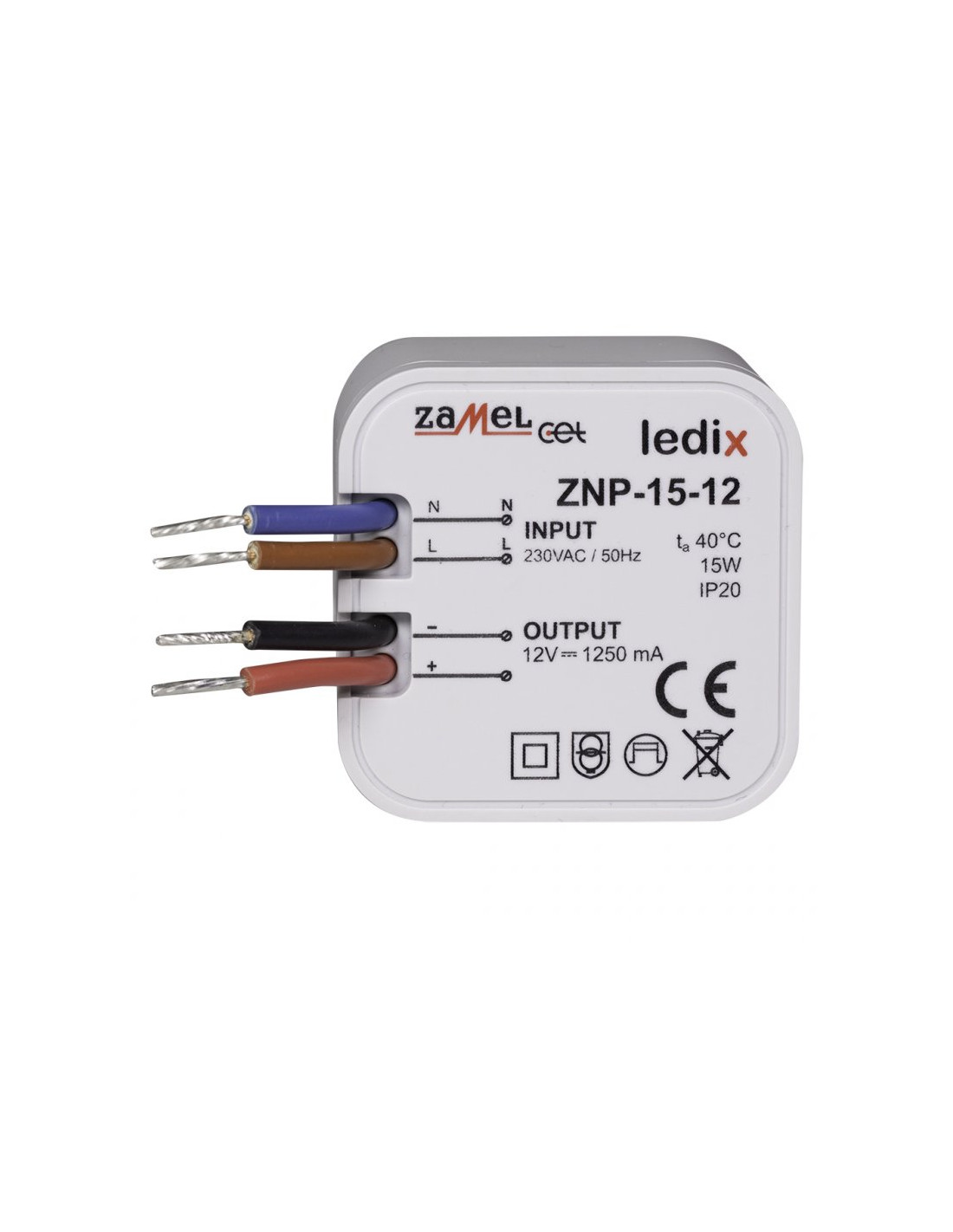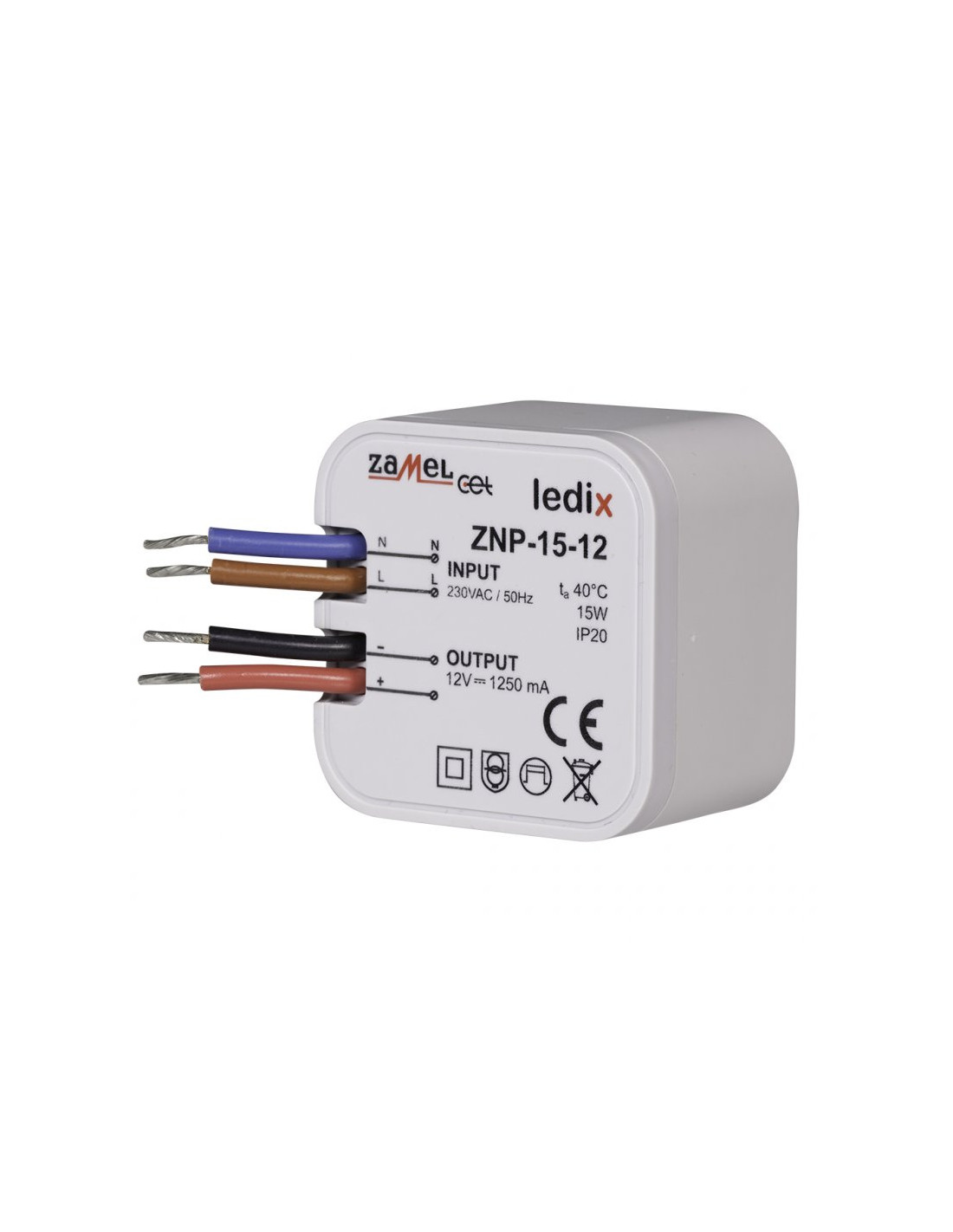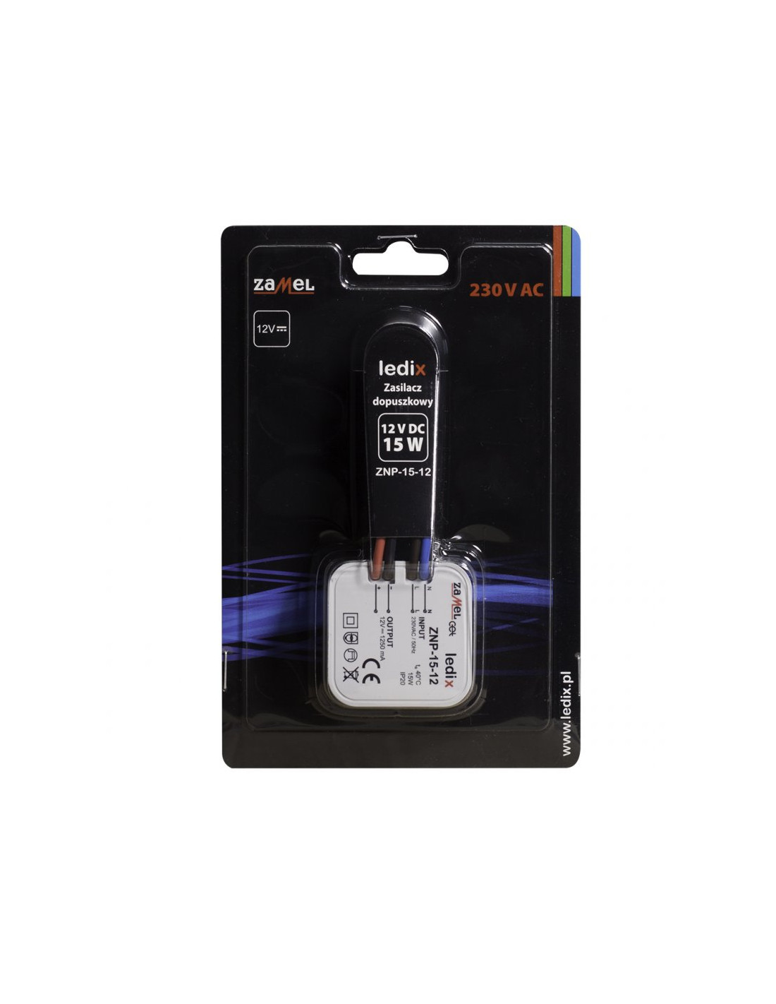 Zasilacz ZNP-15-12 to profesjonalny zasilacz impulsowy o napięciu wyjściowym 12 V DC i mocy znamionowej 15 W. Zasilacz przeznaczony jest do współpracy z produktami LEDIX takimi jak sterowniki i odbiorniki radiowe oraz innymi produktami LED zasilanymi napięciem o wartości 12 V DC. Przeznaczony jest do bezpośredniego montażu w puszce instalacyjnej ?60. Produkt posiada zabezpieczenia przeciwzwarciowe oraz przeciążeniowe, które zwiększają bezpieczeństwo jego użytkowania. Wysoka sprawność oraz bardzo mały pobór mocy w trybie czuwania sprawiają, iż jest to rozwiązanie bardzo ekonomiczne, przeznaczone do pracy ciągłej. Zasilacz spełnia wymagania norm zharmonizowanych.