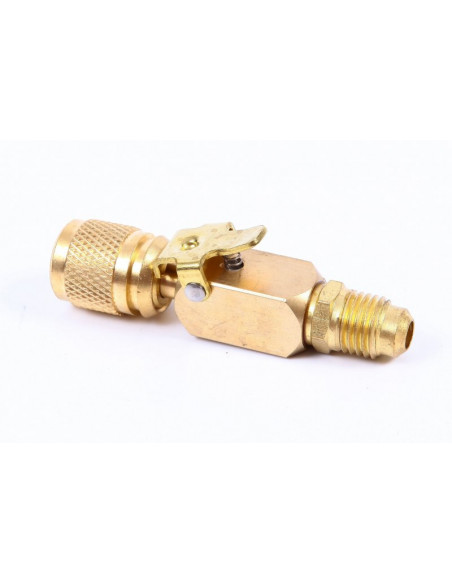 Szybkozłącze proste (gwint wewnętrzny 1/4" x gwint zewnętrzny 1/4" SAE) firmy Imperial stosowane jest do podłączania chłodniczych i klimatyzacyjnych węży serwisowych do zaworów na przyłączach. W miejsce konwencjonalnego gwintowanego łączenia, zastosowano mechanizm push-pull, który pozwala przeprowadzać operację czynnika łatwiej, szybciej i przy pełnej szczelności układu. Rdzeń zaworu cofa się automatycznie, bez potrzeby dodatkowej regulacji. Również podczas odłączania węży nie dochodzi do ubytku czynnika. Automatyczny zawór odcinający zachowuje ciśnienie czynnika chłodniczego w odłączonym wężu.
