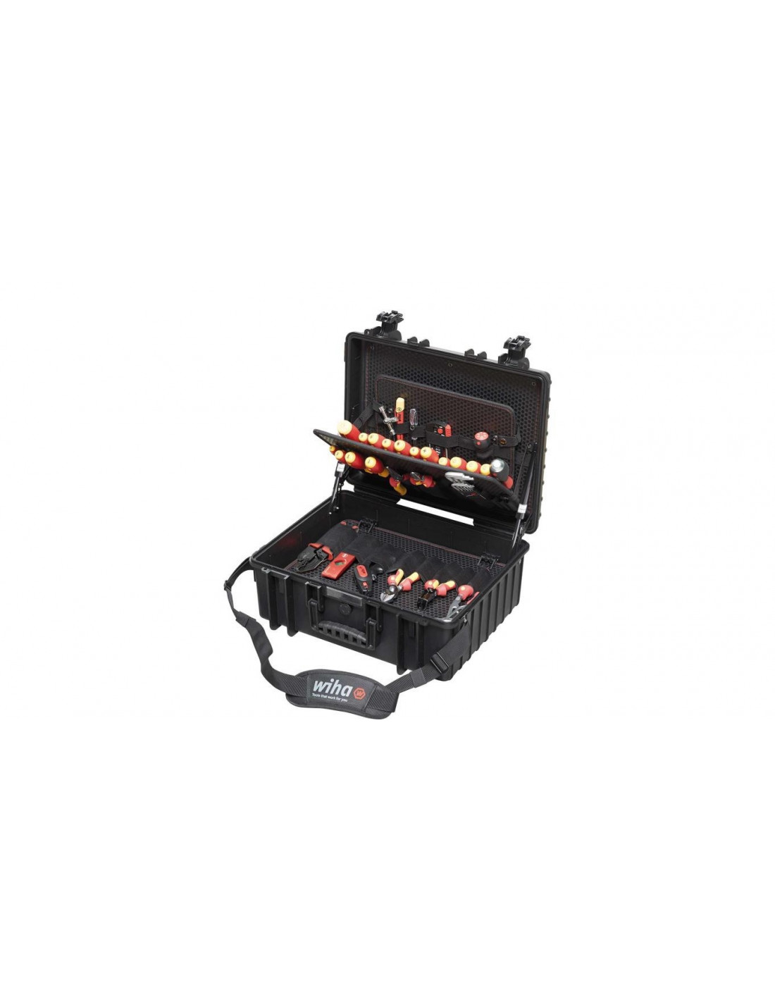 Zestaw 80 niezbędnych narzędzi dla elektryka schowanych w walizce z odpornego tworzywa na kurz, zanieczyszczenia ora wilgoć.