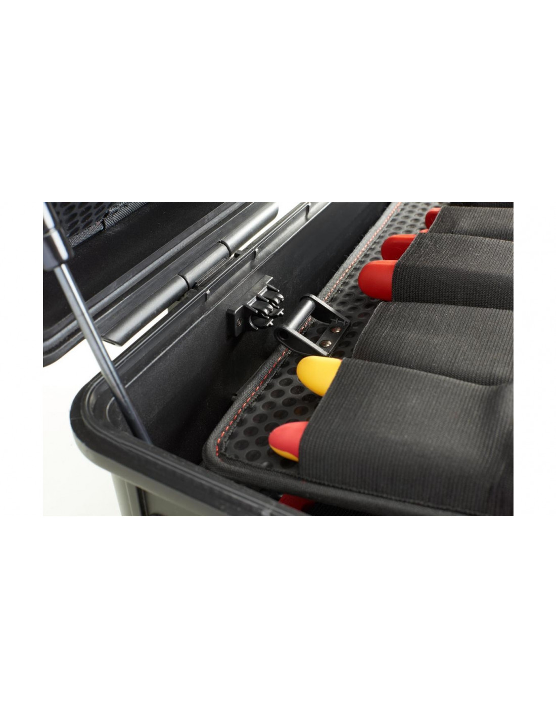 Zaletą walizki jest jej budowa – mocne tworzywo oraz uszczelka umiejscowiona wzdłuż całej walizki – zabezpiecza narzędzia przed pyłem, kurzem oraz wilgocią.
