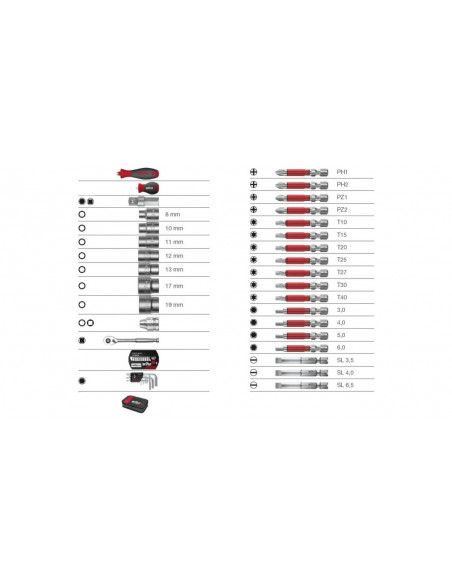 Na wyposażeniu zestawu znajduje się również komplet imbusów chromowanych z kulką, 9cz. w zakresie 1,5-10mm oraz zestaw bitów FlipSelector 13cz., bity 25mm (PH2, PZ1/PZ2/PZ3, Torx15/20/25/30, sześciokątne 3,0/4,0/5,0).