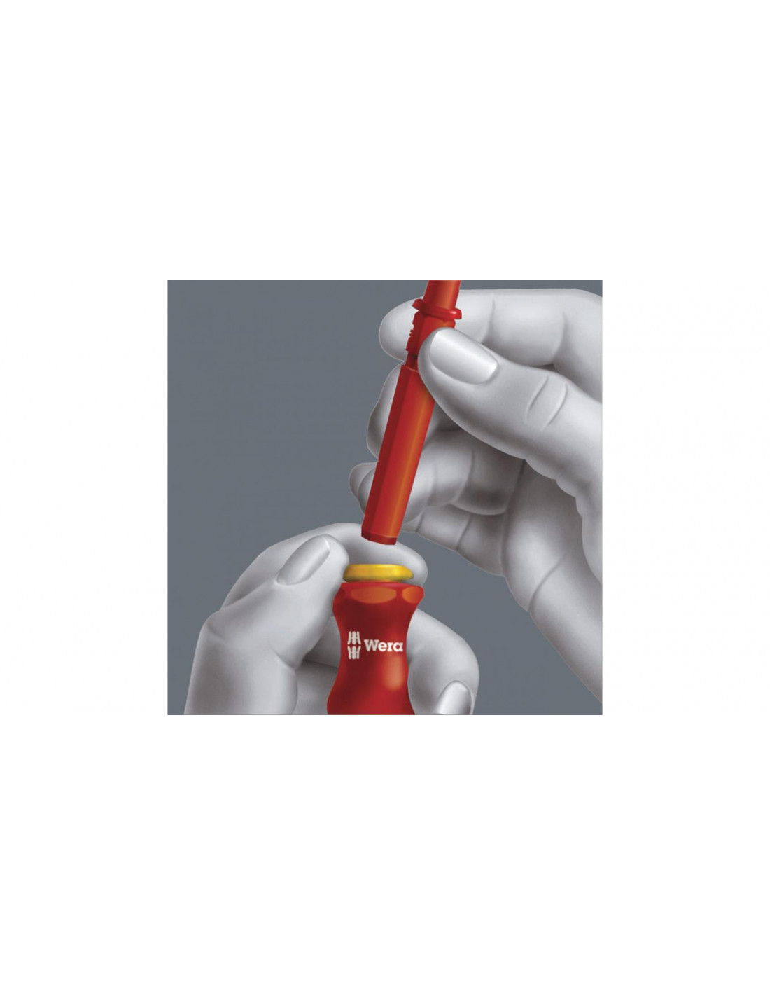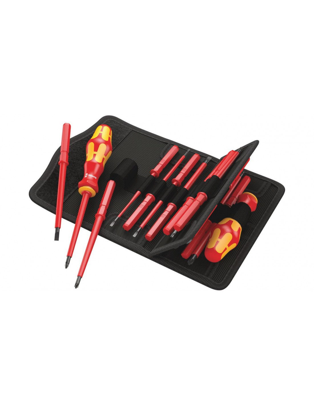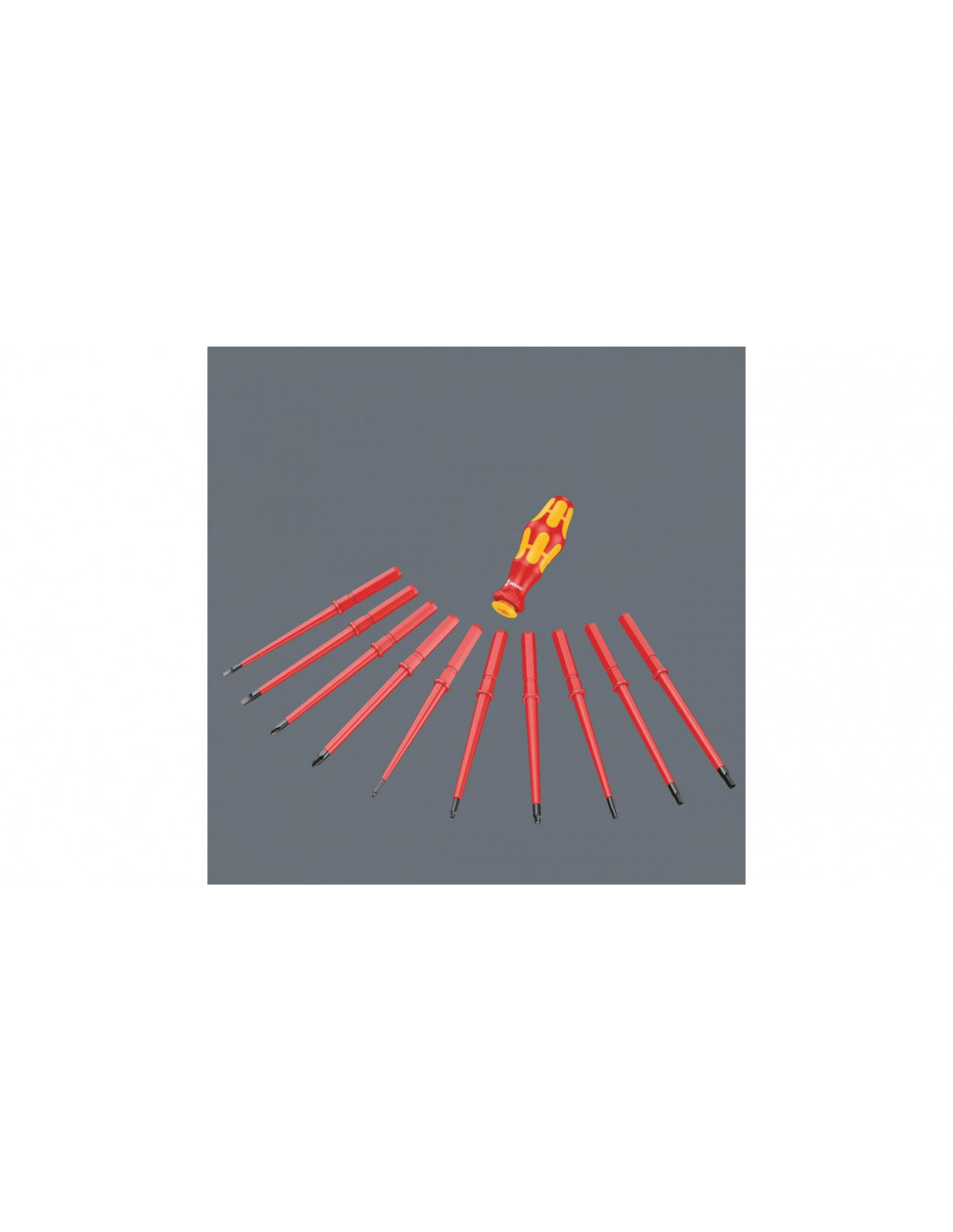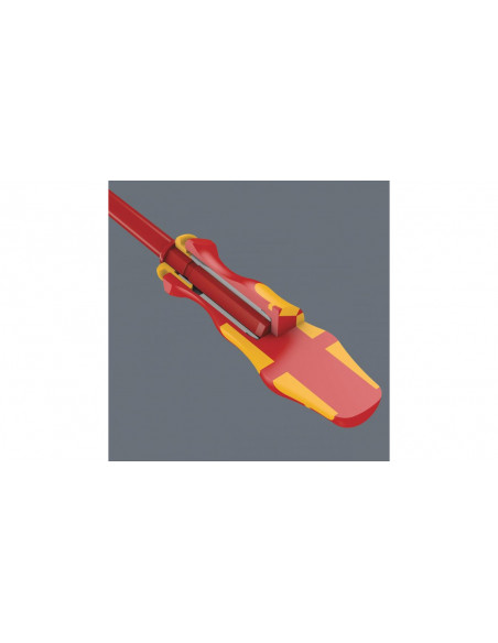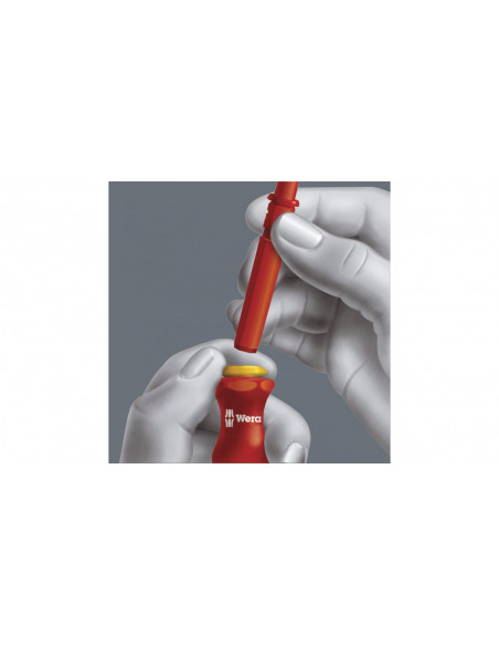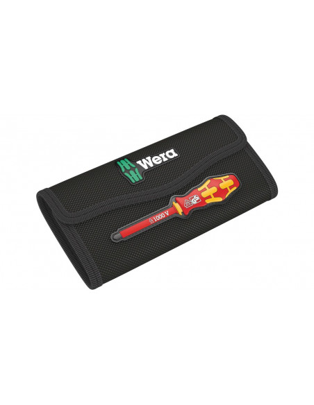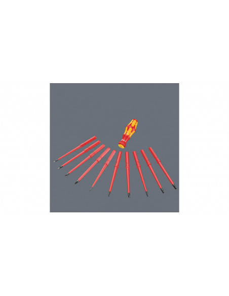 15 wymiennych trzpieni izolowanych VDE z 2 rękojeściami Kraftform 817 VDE w wytrzymałym etui do mocowania na pasku. Każde narzędzie testowane pojedynczo zgodnie z IEC 60900. Indywidualnie kontrolowana izolacja poprzez zanurzenie w kąpieli wodnej pod napięciem 10000 V gwarantuje bezpieczeństwo pracy pod napięciem 1000 V.