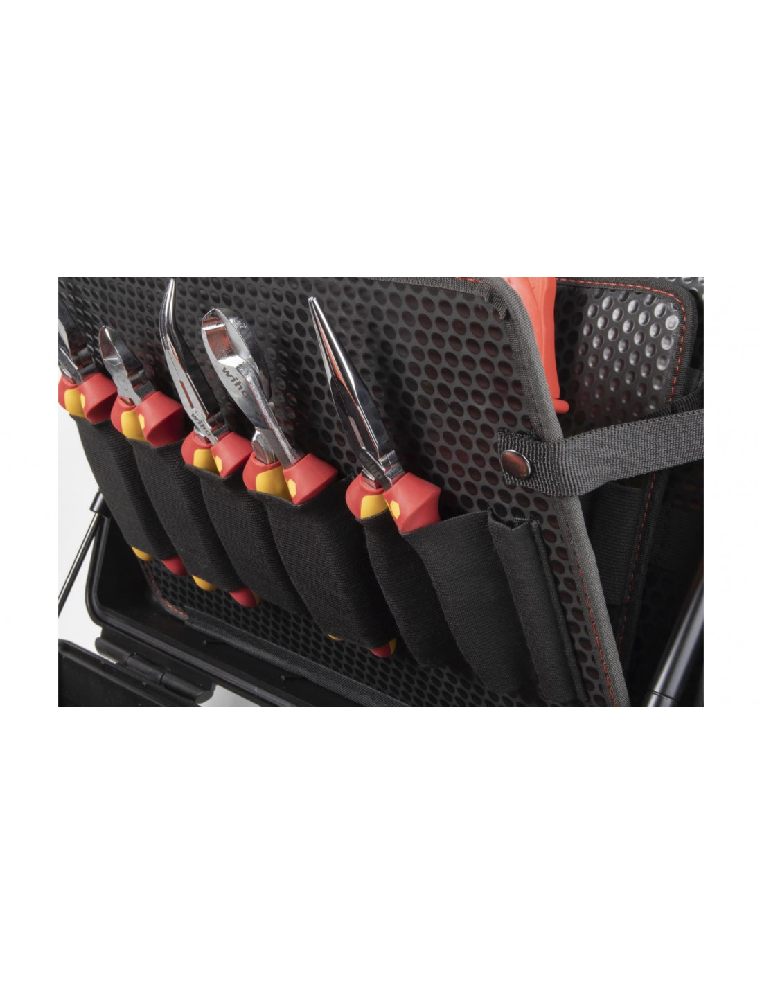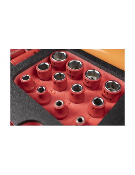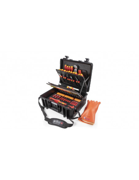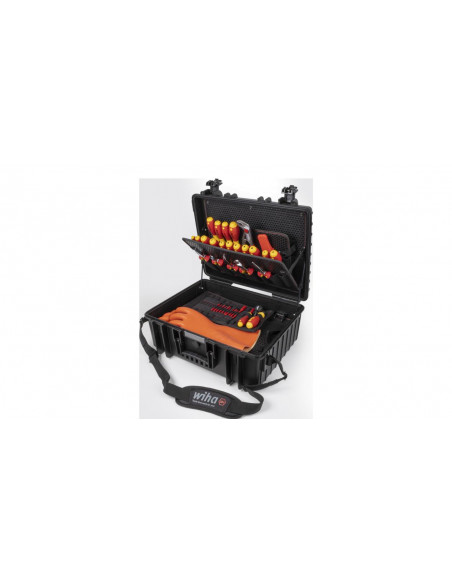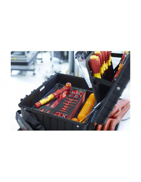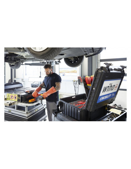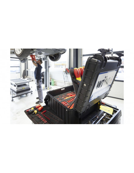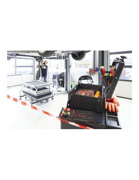Zarówno prace przy pojazdach z napędem elektrycznym, jak i montaż oraz uruchamianie stacji ładowania i skrzynek ściennych, wymagają specjalnych wykwalifikowanych pracowników oraz bezpiecznych, certyfikowanych narzędzi. Walizka narzędziowa XL eMobility pomaga użytkownikowi tak zorganizować akcesoria, by zawsze miał pod ręką odpowiednie narzędzie montażowe lub serwisowe do pojazdów hybrydowych i elektrycznych. Ponadto walizka narzędziowa zawiera optymalny asortyment narzędzi do montażu, uruchomienia i konserwacji stacji ładowania i skrzynek ściennych. Wyposażenie walizki stanowią wysokiej jakości narzędzia ręczne, które dzięki kompaktowej formie przechowywania zawsze są dostępne. Za sprawą certyfikatu VDE izolowane narzędzia zapewniają bezpieczeństwo podczas pracy przy elementach pod napięciem. Przegródki skrzynki narzędziowej zostały skonstruowane z myślą o efektywnej pracy, dlatego też wszystkie narzędzia można wyjmować szybko i łatwo. Dodatkowo zawartość skrzynki można zabezpieczyć przed kradzieżą, zawieszając w przystosowanych do tego celu uchwytach kłódki (nie są one zawarte w wyposażeniu standardowym). Wolne uchwyty i dodatkowe miejsce w dnie zwiększają przestrzeń do przechowywania. Ergonomiczny, dwuelementowy uchwyt zapewnia wygodne transportowanie skrzynki. Skrzynka narzędziowa wykonana z mocnego polipropylenu jest wyposażona w amortyzatory gazowe, utrzymujące pokrywę w różnych pozycjach i zapobiegające jej niekontrolowanemu zatrzaśnięciu, a tym samym odniesieniu obrażeń przez użytkownika. Od próbnika napięcia do klucza dynamometrycznego, od rękawic roboczych do tabliczki ostrzegawczej: w kompletnie wyposażonej skrzynce narzędziowej zawsze masz odpowiednie narzędzie Wiha w zasięgu ręki.