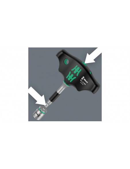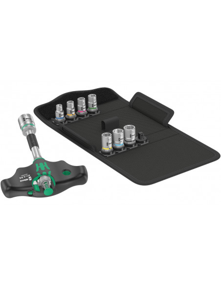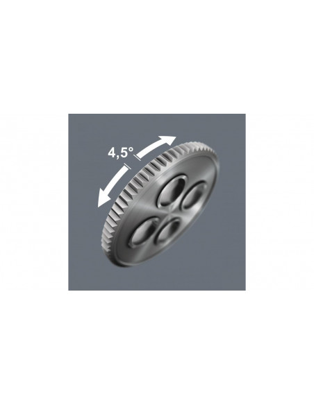 Zestaw 9-częściowy w wytrzymałym pudełku tekstylnym. Wkrętak z rękojeścią poprzeczną do kluczy nasadowych i adapterów 411 A RA z funkcją grzechotki, do kluczy nasadowych 1/4". Drobnozębny mechanizm zapadkowy w rękojeści (80 zębów/kąt powrotu zapadki 4,5°) umożliwia łatwiejsze i szybsze wkręcanie bez konieczności ponownego nasadzania narzędzia. Całkowicie wbudowany w rękojeść mechanizm zapadkowy zapewnia bardzo łatwą i wygodną pracę. Dźwignia przełączająca umożliwiająca wygodną zmianę kierunku pracy prawo/lewo jedną ręką. Ergonomicznie ukształtowana rękojeść wypełnia całą dłoń, a miękkie, zaokrąglone zagłębienia stanowią wsparcie dla palców. Kontakt całej powierzchni dłoni z rękojeścią eliminuje straty tarcia pomiędzy dłonią a rękojeścią. Do kluczy nasadowych czworokątnych 1/4" i adapterów z zabierakiem czworokątnym 1/4", z zatrzaskiem kulkowym. 8 kluczy nasadowych Zyklop 1/4". System wyszukiwania Take it easy: oznaczenie kolorystyczne rozmiaru ułatwiające i przyspieszające odnajdywanie właściwego narzędzia.