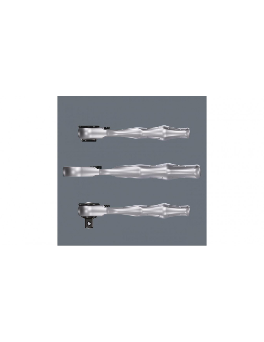 Grzechotka Wera. Prosta obsługa nawet jedną ręką do prac w miejscach trudno dostępnych. Wykonana ze stali kutej matrycowo. Drobna podziałka z 60 zębami i małym kątem pracy wynoszącym 6° do prac precyzyjnych. Obrotowy, radełkowany pierścień pozwala na sprawną pracę. Łatwe przełączanie kierunku prawo-lewo. Ergonomiczna konstrukcja główki i przełącznika. Do grotów i nasadek 1/4".