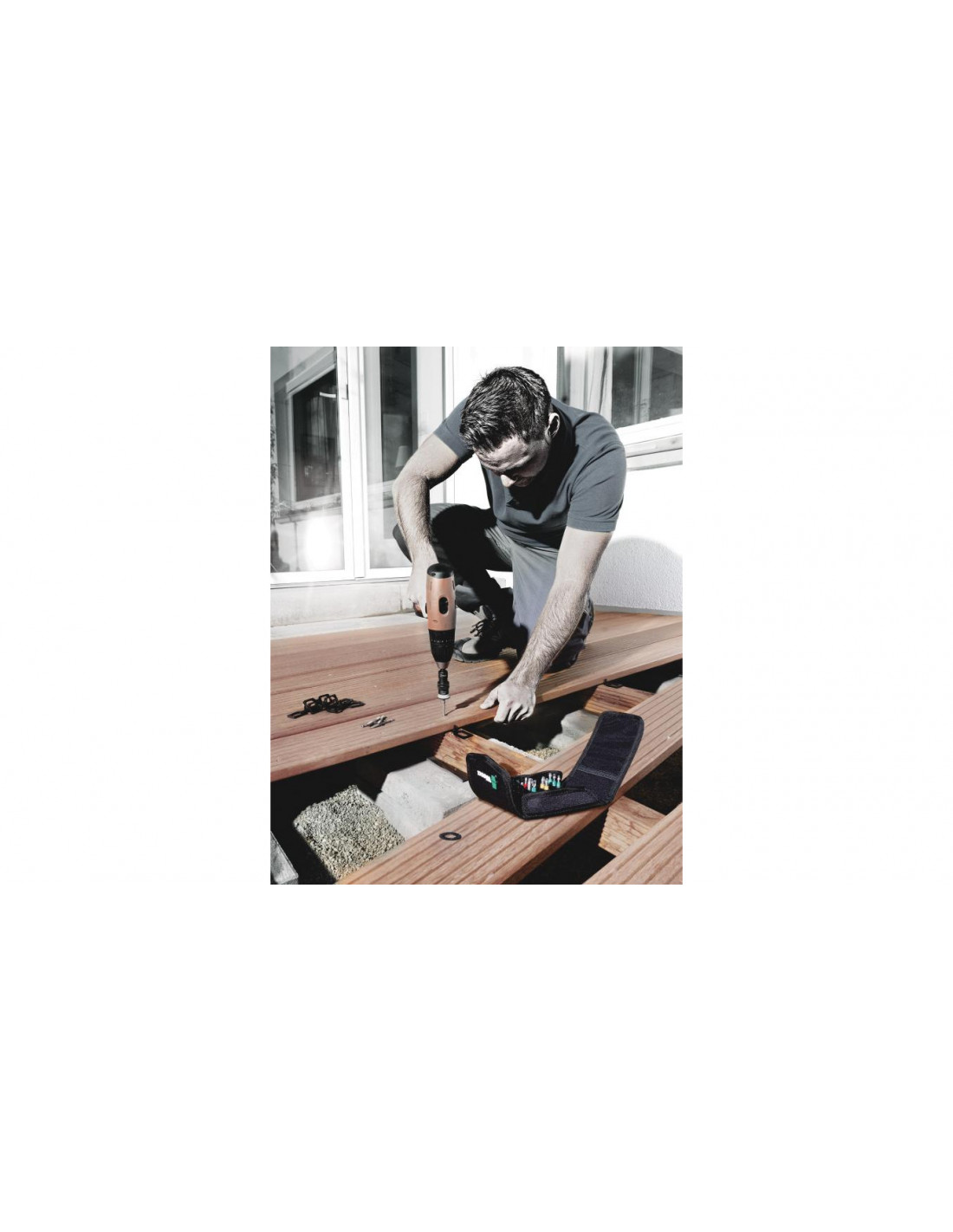 Kompaktowy zestaw 17 najważniejszych narzędzi wkrętakowych do budowy tarasów. Bity w wykonaniu ze stali nierdzewnej zapobiegające powstawaniu korozji nalotowej. Przemyślany uchwyt na bity umożliwia równomierne zagłębianie się łba wkrętu dzięki regulowanemu ograniczeniu głębokości wkręcania oraz zapobiega uszkodzeniu powierzchni drewnianej podłogi za pomocą przymocowanego filcowego pierścienia.
