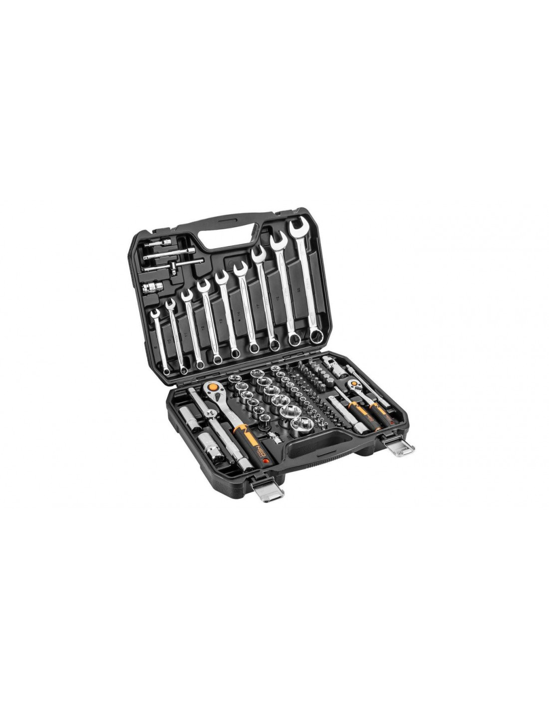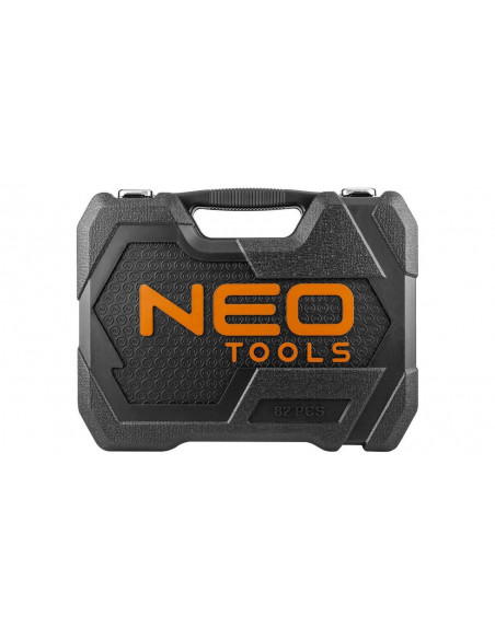 Zestaw kluczy nasadowych 1/2" i 1/4" NEO (nr ref. 10-059) składa się z 82 elementów, wykonanych z wysokiej jakości stali chromowo-wanadowej.