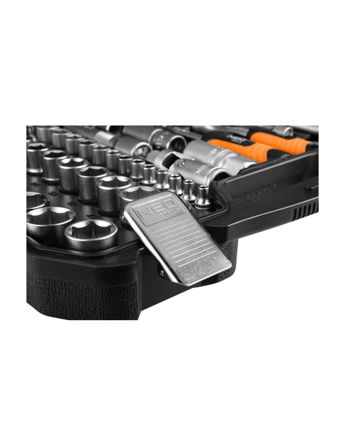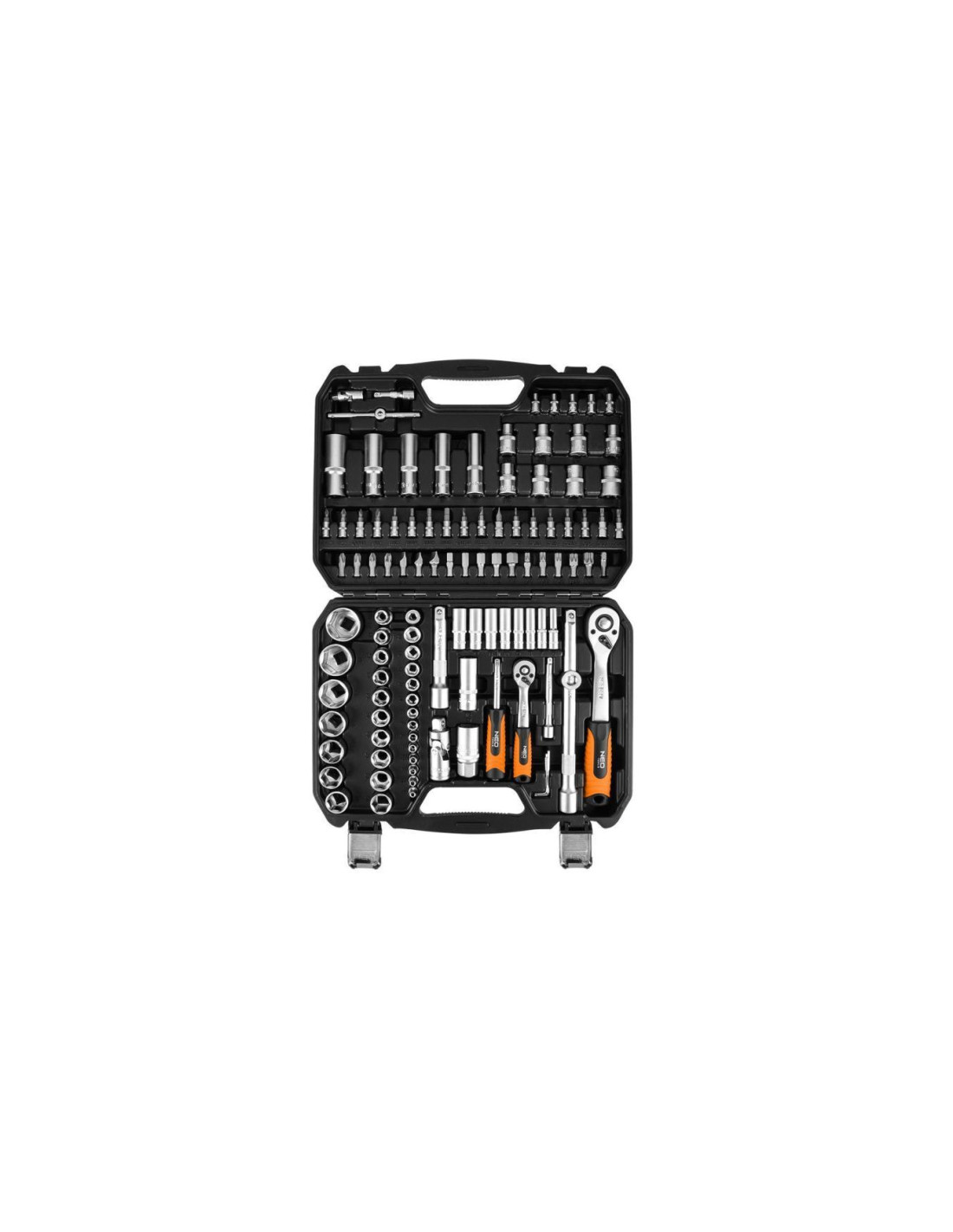 Zestaw kluczy 110 elementów ½” ¼” 10-211 marki NEO TOOLS to kompleksowy pakiet narzędzi w rozmiarze ½” oraz ¼” z satynowym wykończeniem, umieszczonych w wygodnej walizce z tworzywa sztucznego z zatrzaskami oraz komfortową w obsłudze rękojeścią.