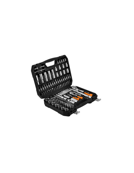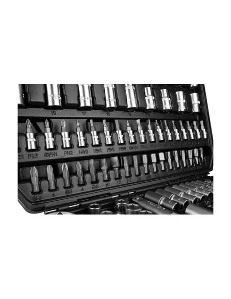 Zestaw zawiera: nasadki sześciokątne 1/2" 17 szt.: 10, 11, 12, 13, 14, 15, 16, 17, 18, 19, 20, 21, 22, 24, 27, 30, 32 mm, nasadki długie 1/2" 5 szt.: 14, 15, 17, 19, 22 mm, nasadki Torx 1/2" 8 szt.: E10, E11, E12, E14, E16, E18, E20, E24, grzechotkę 1/2", 72 zęby, pokrętło typu T 1/2", przedłużki 1/2" 2 szt.: 125 mm i 250 mm, nasadki do świec 1/2", adapter bitów 5, 16", przegub 1/2", nasadki sześciokątne 1/4" 13 szt.: 4, 4.5, 5, 5.5, 6, 7, 8, 9, 10, 11, 12, 13, 14 mm, nasadki sześciokątne 1/4" 8 szt.: 6, 7, 8, 9, 10, 11, 12, 13 mm, nasadki Torx 1/4" 5 szt.: E4, E5, E6, E7, E8, grzechotkę 1/4", 72 zęby, uchwyt do bitów 1/4", pokrętło typu T 1/4", przedłużki 1/4" 2 szt.: 50 mm i 100 mm, przegub 1/4", nasadki 1/4" 18 szt.: T8, T10, T15, T20, T25, T27, T30, H3, H4, H5, H6 mm, PH1, PH2, PZ1, PZ2, SL4, SL5, SL7, bity 5, 16" 17 szt.: TX40, TX45, TX50, TX55, TX60, HEX7, HEX8, HEX10, HEX12, HEX14, PH3, PH4, PZ3, PZ4, SL8, SL10, SL12, klucze sześciokątne 4 szt.: 1.3, 1.5, 2, 2.5 mm.