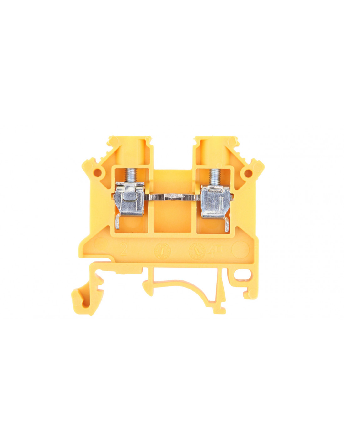 Złączka szynowa gwintowana w kolorze żółtym. Służy do łączenia pod względem mechanicznym i elektrycznym przewodów w instalacjach i urządzeniach elektrycznych. Złączki tego typu są wykorzystywane do przewodów drutowych i linkowych dla niskich i średnich napięć.