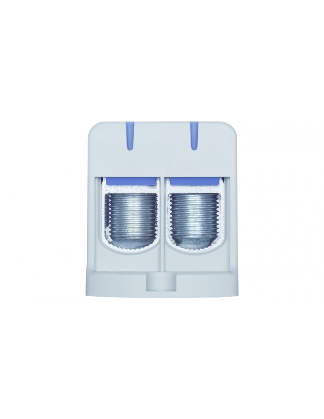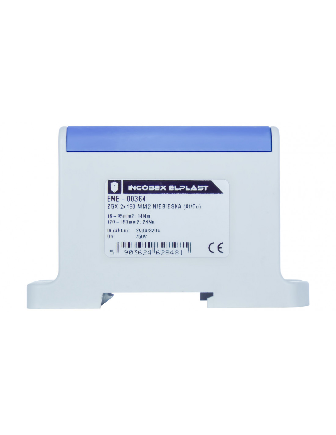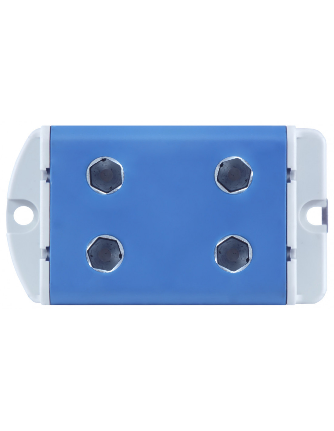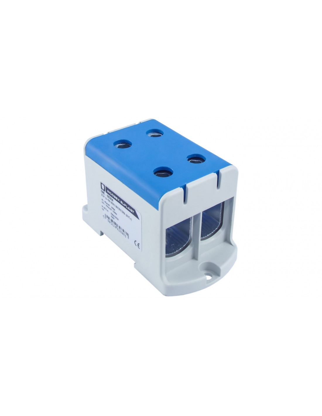 Uniwersalna złączka śrubowa ZGX, jednobiegunowa z czterema otworami, w kolorze niebieskim, dla przewodów o przekroju od 35 do 150 mm2, w kompaktowej obudowie o małych wymiarach, wykonanej z tworzywa PA6 bez halogenowego, sklasyfikowanego w najwyższym standardzie palności UL V-0 (test pionowego palenia), możliwy montaż złączki zarówno na szynie TH jaki i bezpośrednio na płycie montażowej, z zaciskami na śrubę sześciokątną, które pozwalają na łatwe i mocne dokręcanie przewodu. Złączki ZGX są testowane i certyfikowane zgodnie z normą EN 60947-7-1:2012 oraz EN 61238-1.