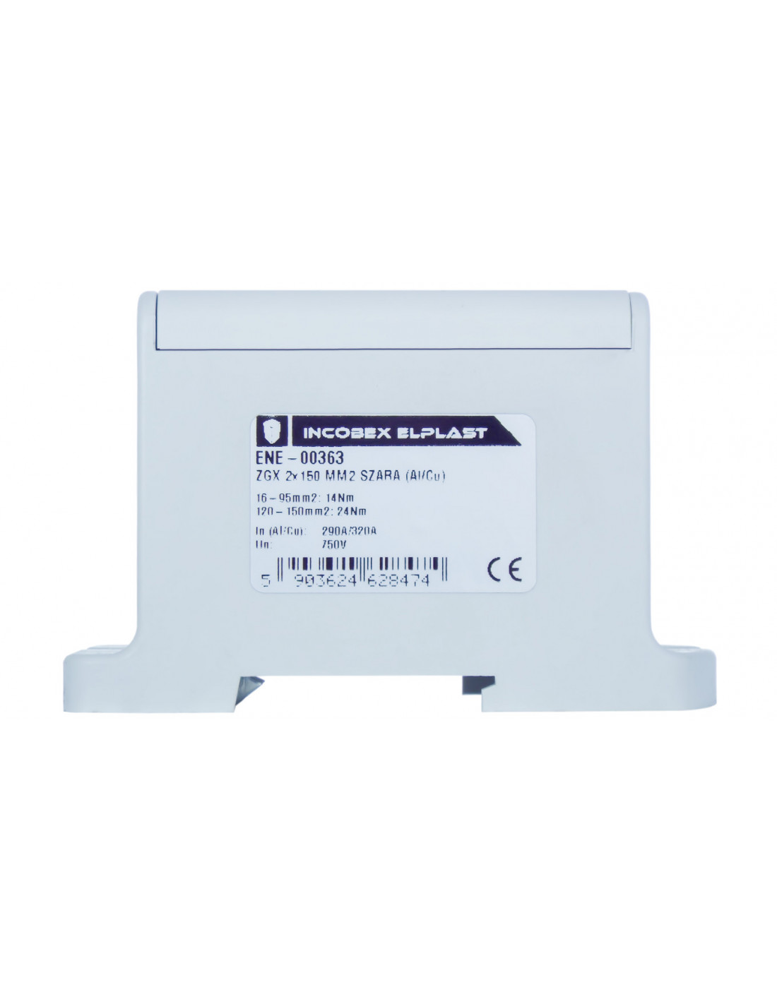 Uniwersalna złączka śrubowa ZGX, jednobiegunowa z czterema otworami, w kolorze szarym, dla przewodów o przekroju od 35 do 150 mm2, w kompaktowej obudowie o małych wymiarach, wykonanej z tworzywa PA6 bez halogenowego, sklasyfikowanego w najwyższym standardzie palności UL V-0 (test pionowego palenia), możliwy montaż złączki zarówno na szynie TH jaki i bezpośrednio na płycie montażowej, z zaciskami na śrubę sześciokątną, które pozwalają na łatwe i mocne dokręcanie przewodu. Złączki ZGX są testowane i certyfikowane zgodnie z normą EN 60947-7-1:2012 oraz EN 61238-1.