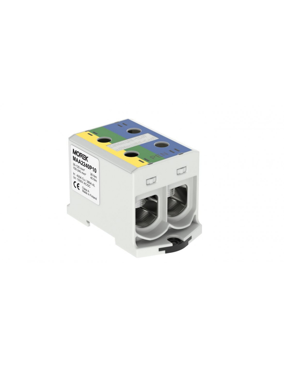 Złącza OTL-PEN firmy MOREK przeznaczone są do instalacji TN-C-S. Zastosowanie w zaciskach kolorów żółto-zielonego oraz niebieskiego znacząco ułatwia uporządkowanie instalacji elektrycznej rozdzielnicy, pozwalając na jednoznaczne określenie i oznakowanie punktu podziału przewodu neutralno-ochronnego PEN na oddzielnie przewody N i PE, czyli na zmianę konfiguracji sieci z TN-C na TN-C-S. Jednocześnie złącza OTL-PEN zachowują wszystkie dotychczasowe zalety serii OTL : napięcie znamionowe 1000 V AC/DC, współpraca z przewodami AL/CU każdego typu, klasa palności obudowy UL94 V0, klasa zwarciowa A. Szybki i łatwy montaż na szynie DIN umożliwia zastosowanie w zaciskach mechanizmu montażowego ClickSet™. Alternatywnym sposobem montażu złączek jest zastosowanie śrub. Złącza OTL-PEN dostępne są w czterech przekrojach: 50 mm 2 , 95 mm 2 , 150 mm 2 i 240 mm 2 .